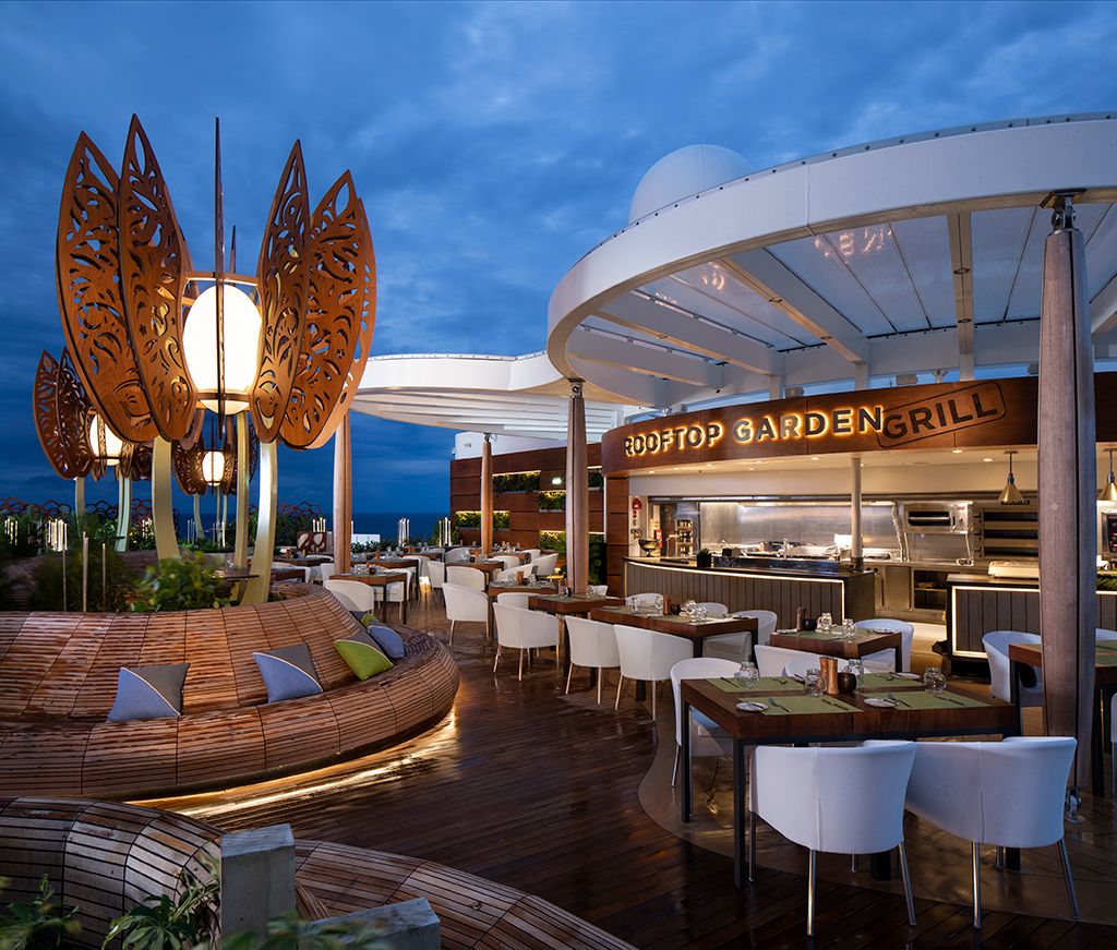 On The Resort Deck, which can be found on our Edge® Class ships, you'll enjoy the main pool area, the new Rooftop Garden, the jogging track, and the adults-only Solarium.