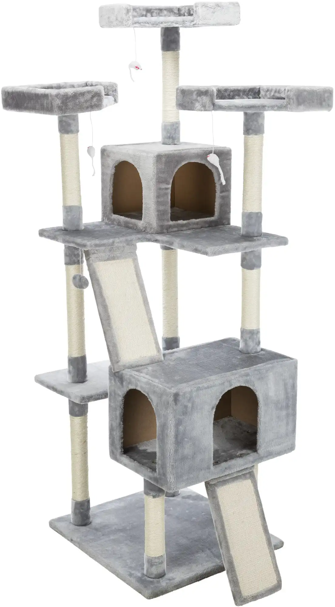 HqYlHrbUHere you can buy Celeste Gray Tower 69in with Three Scratching Columns, Two Condos, Two Climbing Ramps, Three Edged Platforms, Dangling Toys with free delivery to your post office.