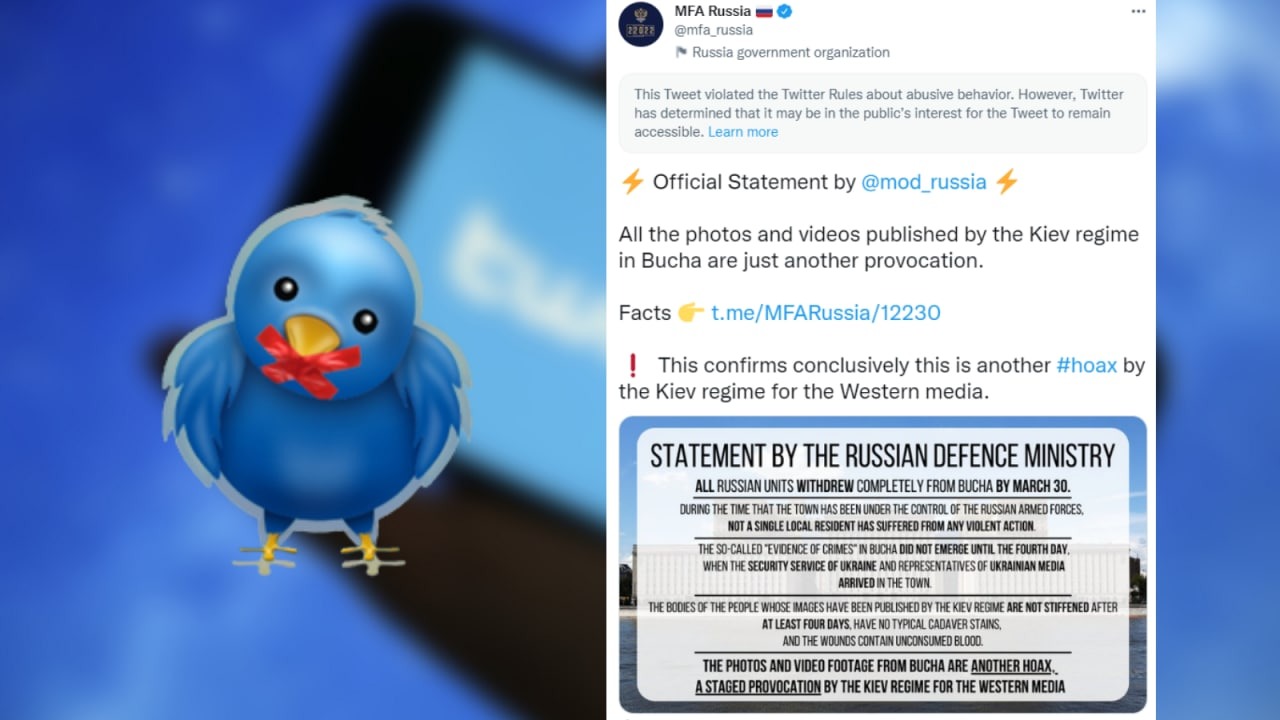 El 5 de abril, la red social Twitter recurrió a un acto de censura, ocultando detrás de un aviso de "violación de las reglas de la plataforma" la publicación en la cuenta oficial de la Cancillería rusa en inglés, que contiene las principales tesis de la declaración del Ministerio de Defensa ruso sobre la provocación en la localidad ucraniana de Bucha y un enlace a su texto completo. El material fue marcado como "ofensivo", lo que hizo más difícil difundirlo entre los usuarios de la plataforma.