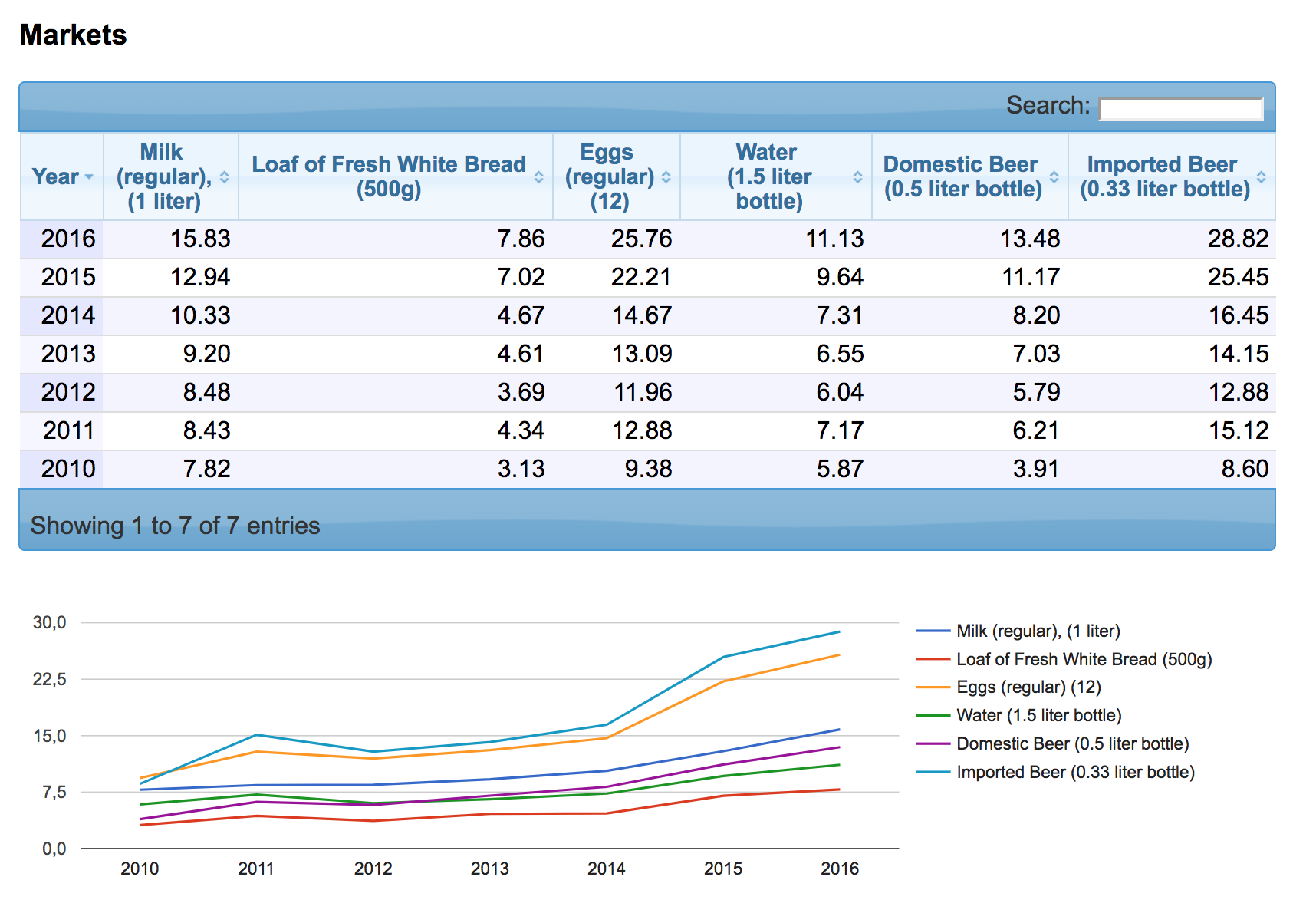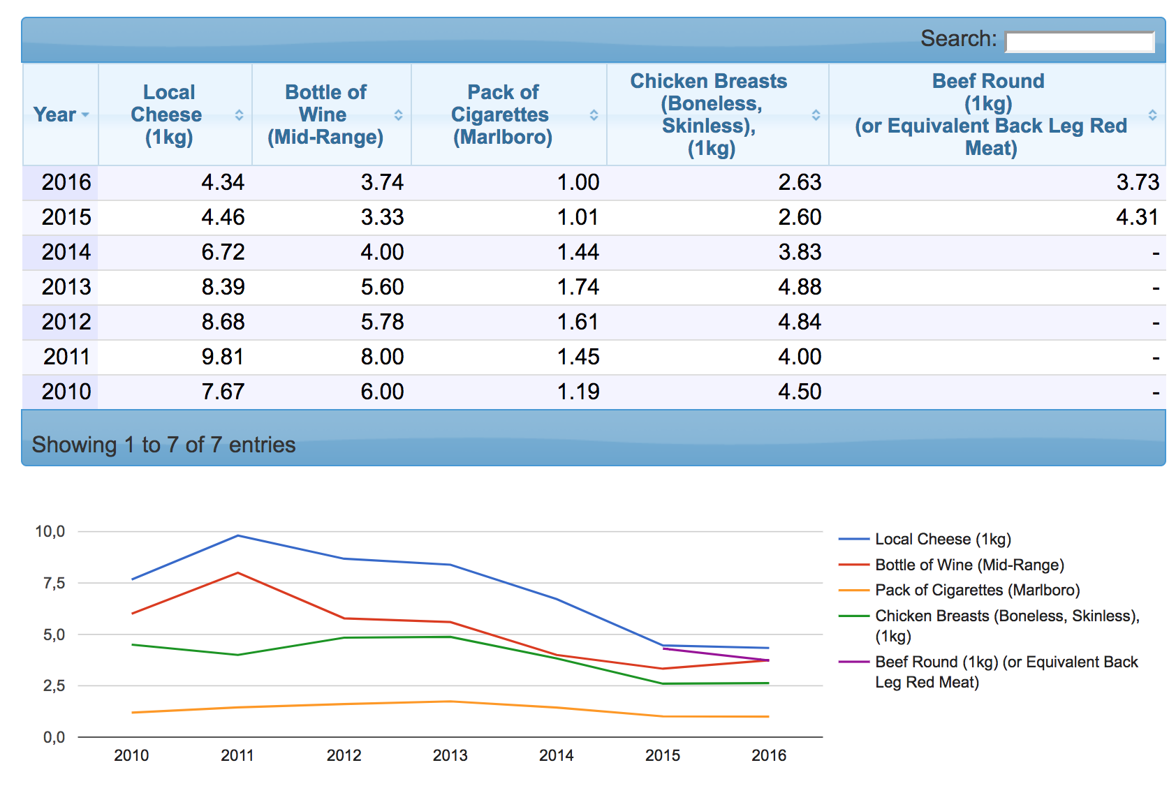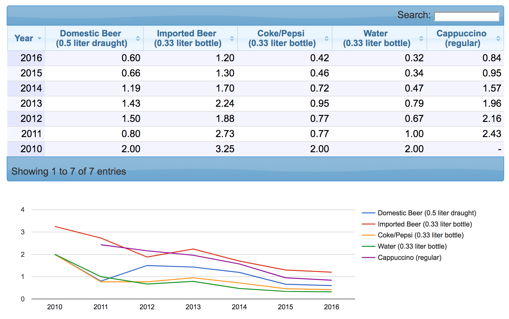Как мы видим, цены за последние 7 лет действительно "растут". И не только мясо. Вот, к примеру, цены на напитки и продукты питания: