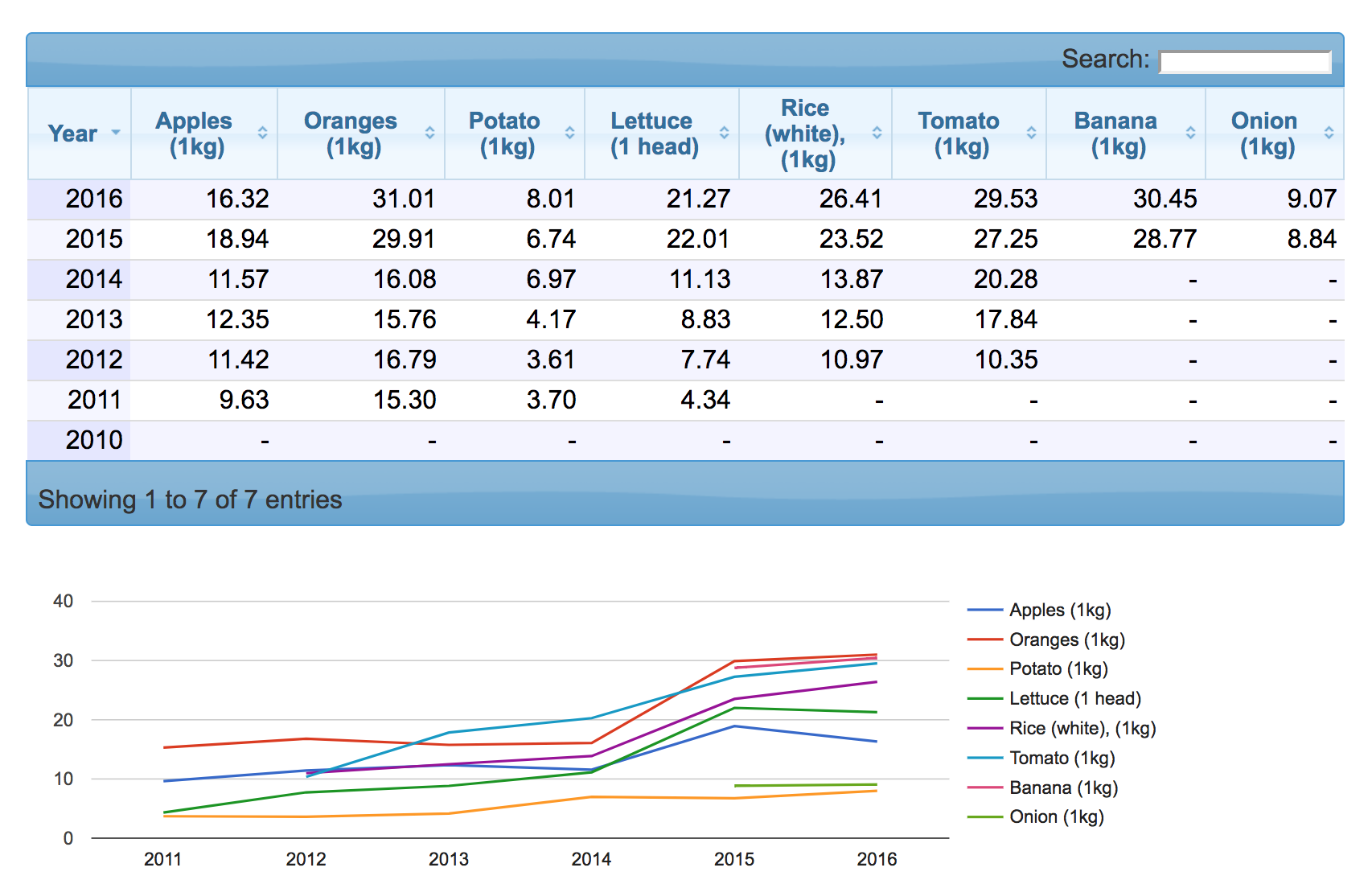 Итак, к сути. Как вы знаете, большинство людей убеждено, что цены в наших магазинах за товары и цены за услуги "повышаются". Принято считать, что ценовой рост огромен, что люди очень бедны, что скоро наступит чуть ли не голод. И многие графики вроде как подтверждают это. Возьмем, для наглядности, цены на продукты питания за последние 7 лет в городе Киев. Возьмем цены на мясо из киевского ресторана: