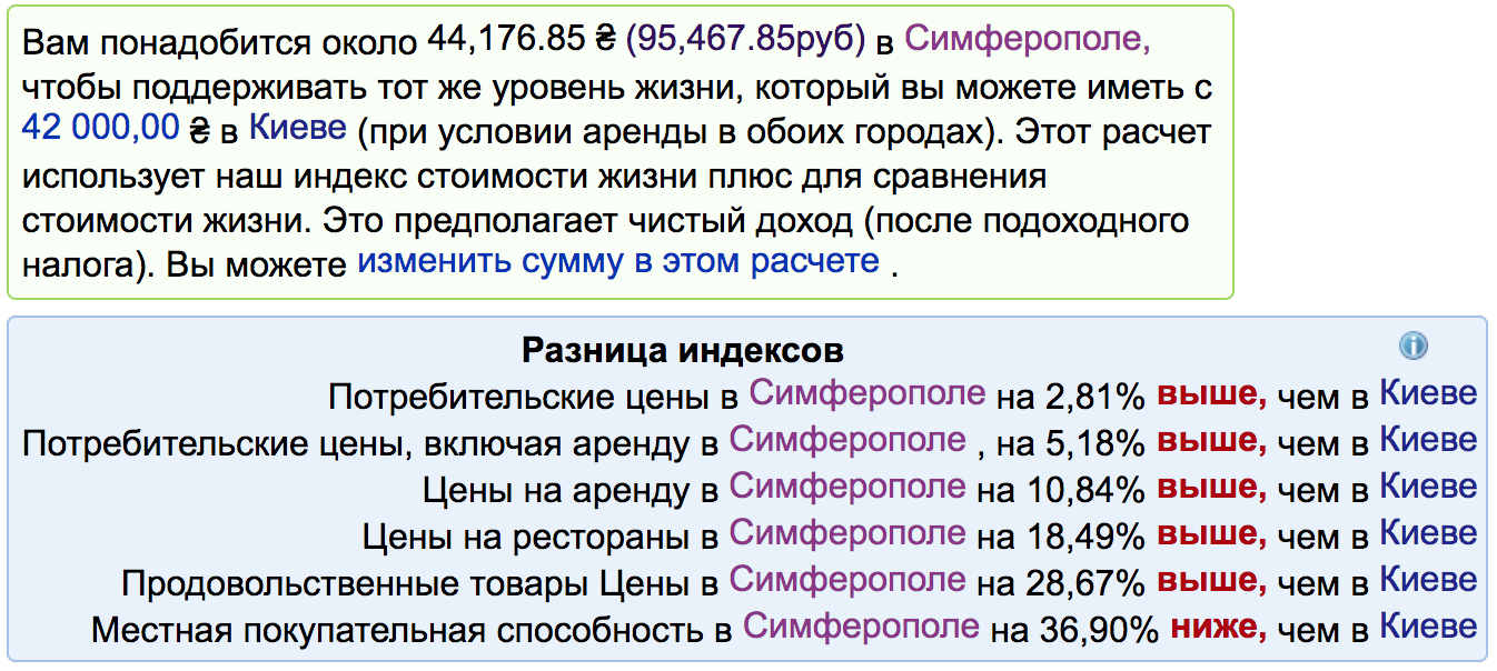Даже Симферополь, в котором я родился, и из которого я в 2014-м году переехал в Киев, обходился бы мне намного дороже. Из-за оккупации, из-за огромной инфляции (Путин завалил Крым халявными деньгами), из-за уничтожения украинского бизнеса и игнорирования полуострова со стороны российского бизнеса (из-за санкций). Молодежь уезжает, старики не могут работать, госслужащие своими высокими зарплатами и национализацияей разоряют и уничтожают частный сектор (инфляция). Вот сравнительные цифры (более подробную информацию вы можете увидеть по ссылке в конце публикации):
