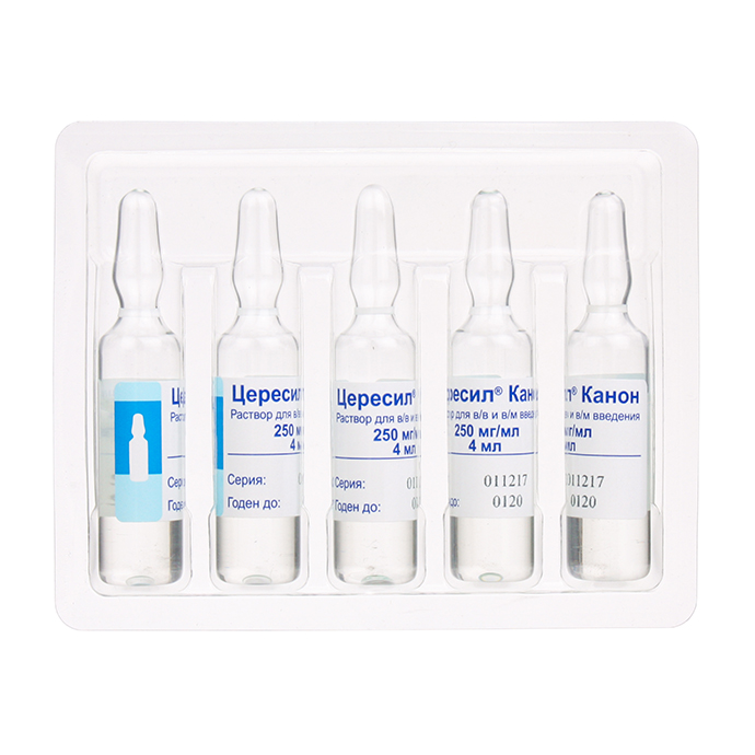 Цена на Цересил Канон в аптеках . В аптечных сетях цена на Цересил Канон, раствор для в/в и в/м введения, за упаковку с 5 ампулами по 4 мл составляет: дозировка 125 мг/мл - от 442 до 497 руб .; дозировка 250 мг/мл - от 756 до 860 руб .