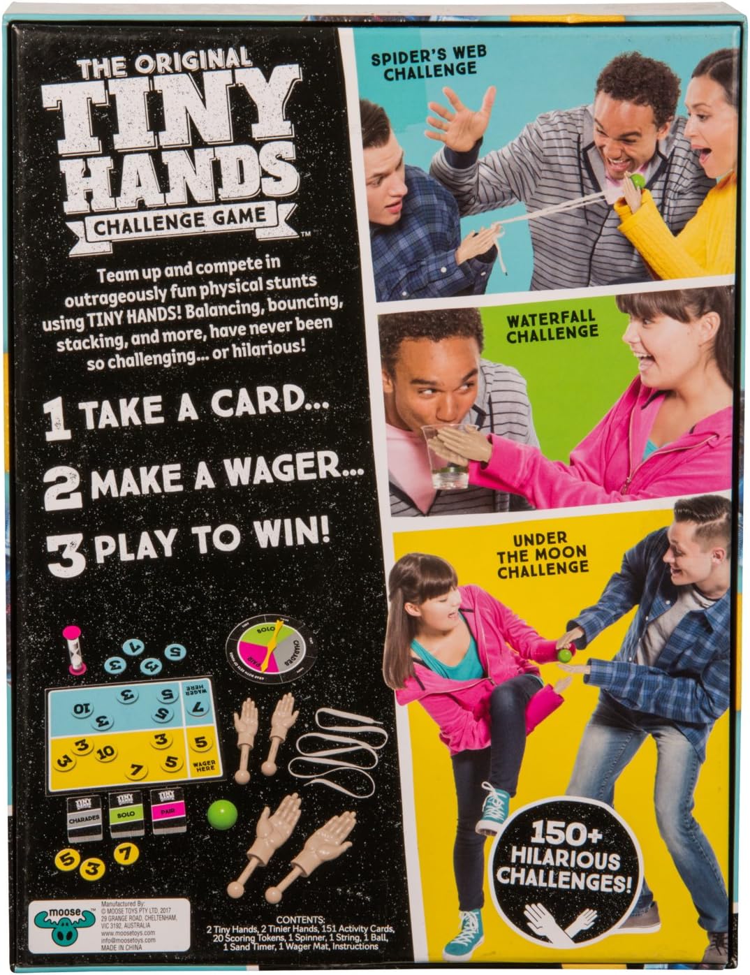 The Original Tiny Hand Challenge Game pits teams against each other, as they wager their bets and complete challenges . The spinner will decide whether each team must complete a solo challenge, team challenge, or round of charades using the tiny hands, tinier hands, or both . The goal of the game is to be the first team to reach 31 points .