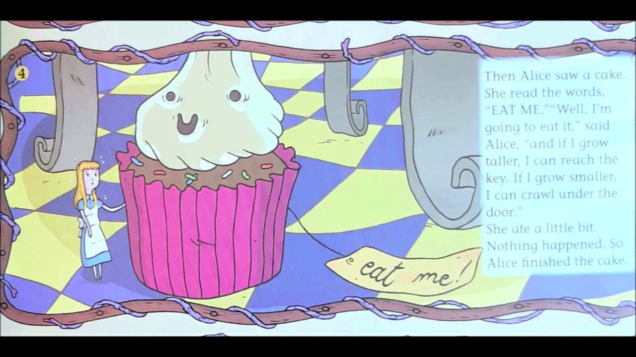 Soon her eye fell on a little glass box that was lying under the table: she opened it, and found in it a very small cake, on which the words 'EAT ME' were beautifully marked in currants. 'Well, I'll eat it,' said Alice, 'and if it makes me grow larger, I can reach the key; and if it makes me grow smaller, I can creep under the door; so either way I'll get into the garden, and I don't care which happens!'