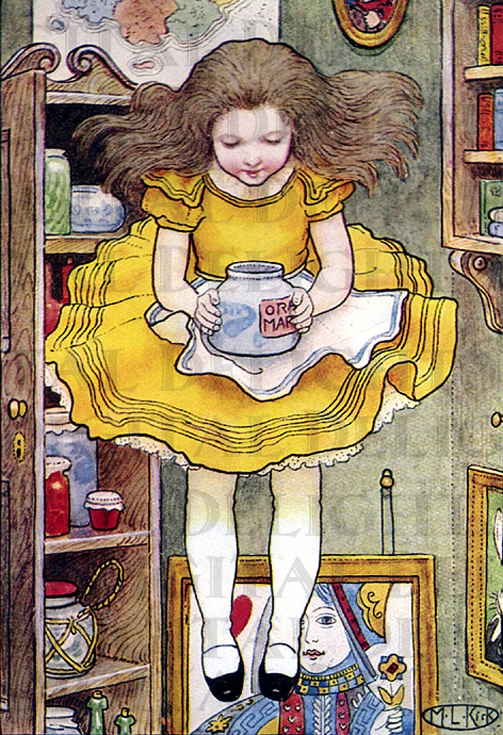 Either the well was very deep, or she fell very slowly, for she had plenty of time as she went down to look about her and to wonder what was going to happen next. First, she tried to look down and make out what she was coming to, but it was too dark to see anything; then she looked at the sides of the well, and noticed that they were filled with cupboards and book–shelves; here and there she saw maps and pictures hung upon pegs. She took down a jar from one of the shelves as she passed; it was labelled 'ORANGE MARMALADE', but to her great disappointment it was empty: she did not like to drop the jar for fear of killing somebody, so managed to put it into one of the cupboards as she fell past it.