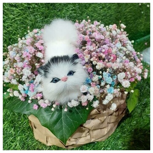 Un chat espiègle dans un panier a l’air vivant ! La gypsophile peut être vaporisée de laque et séchée, puis cette composition vous ravira pendant de nombreux mois.