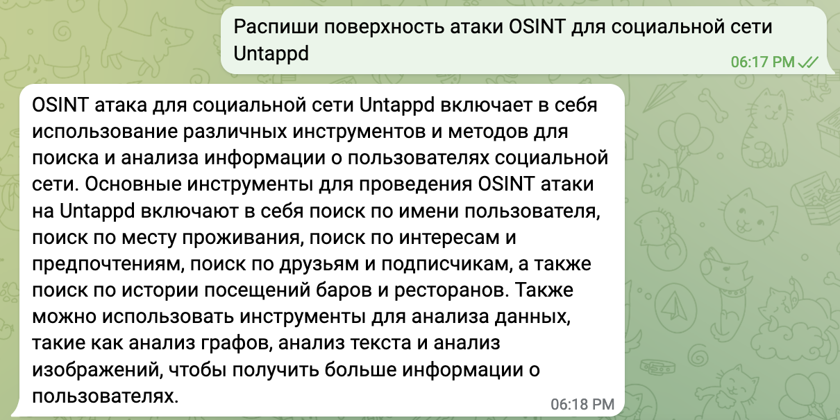 Как она всё это делает? Краткий технический разбор на русском языке можете прочесть здесь, а мы двинемся дальше — к использованию чат-бота в типовых для OSINT задачах. Попутно выявим и некоторые её важные особенности.