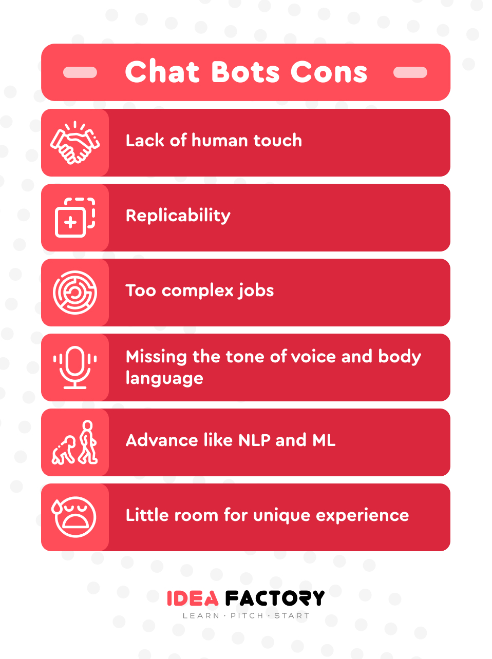 Chatbots are designed for simple and repetitive tasks. They can`t do highly complex and creative jobs without human control. Besides, chatbots get stuch in unscripted scenarios and end up useless. To make your bot more powerful, you need more time, money, and qualified specialists.