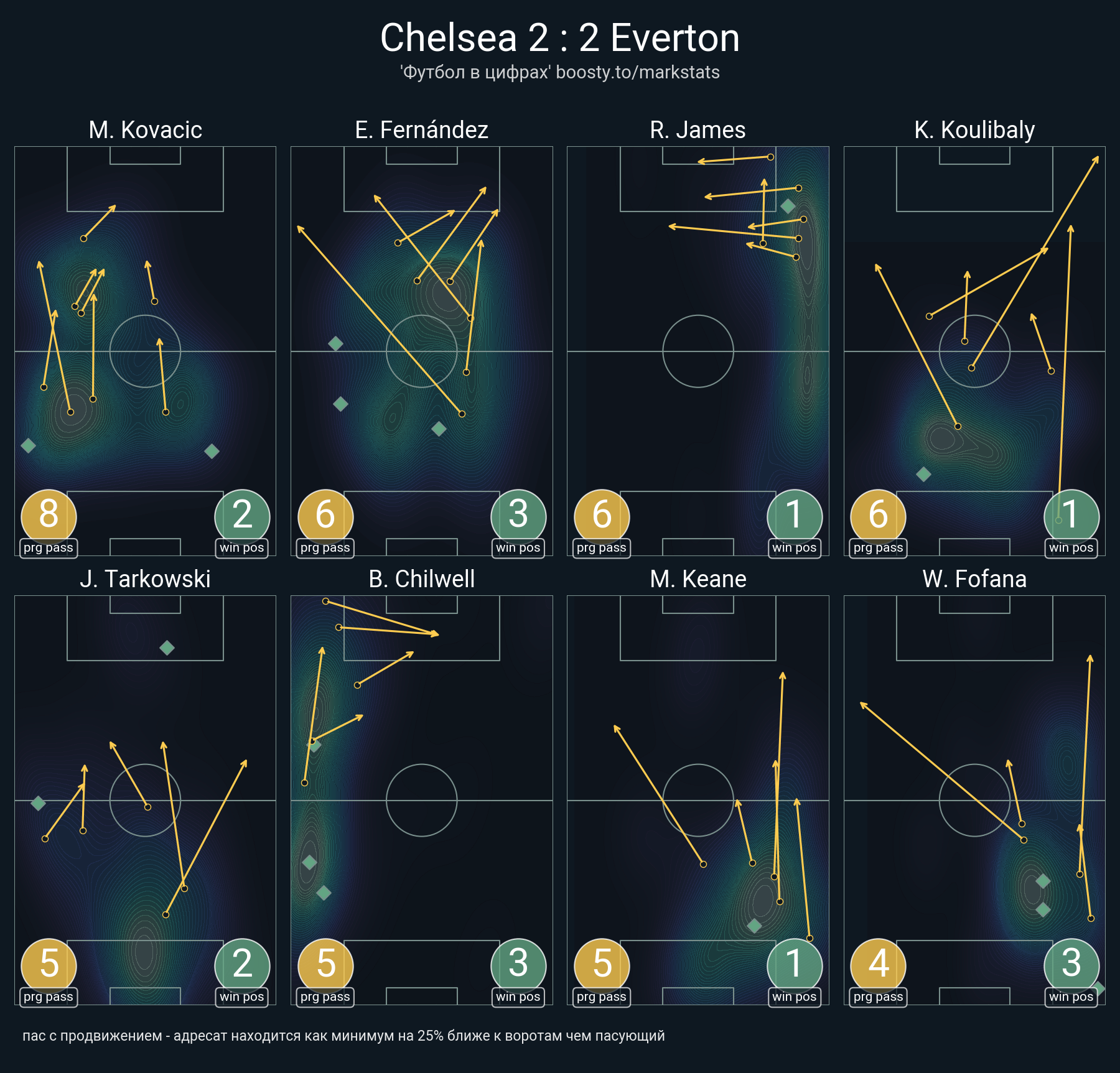 61 успешных передач из 82 попыток (1 ассист, 4 под удар, 5 с продвижением, 21 на трети соперника)