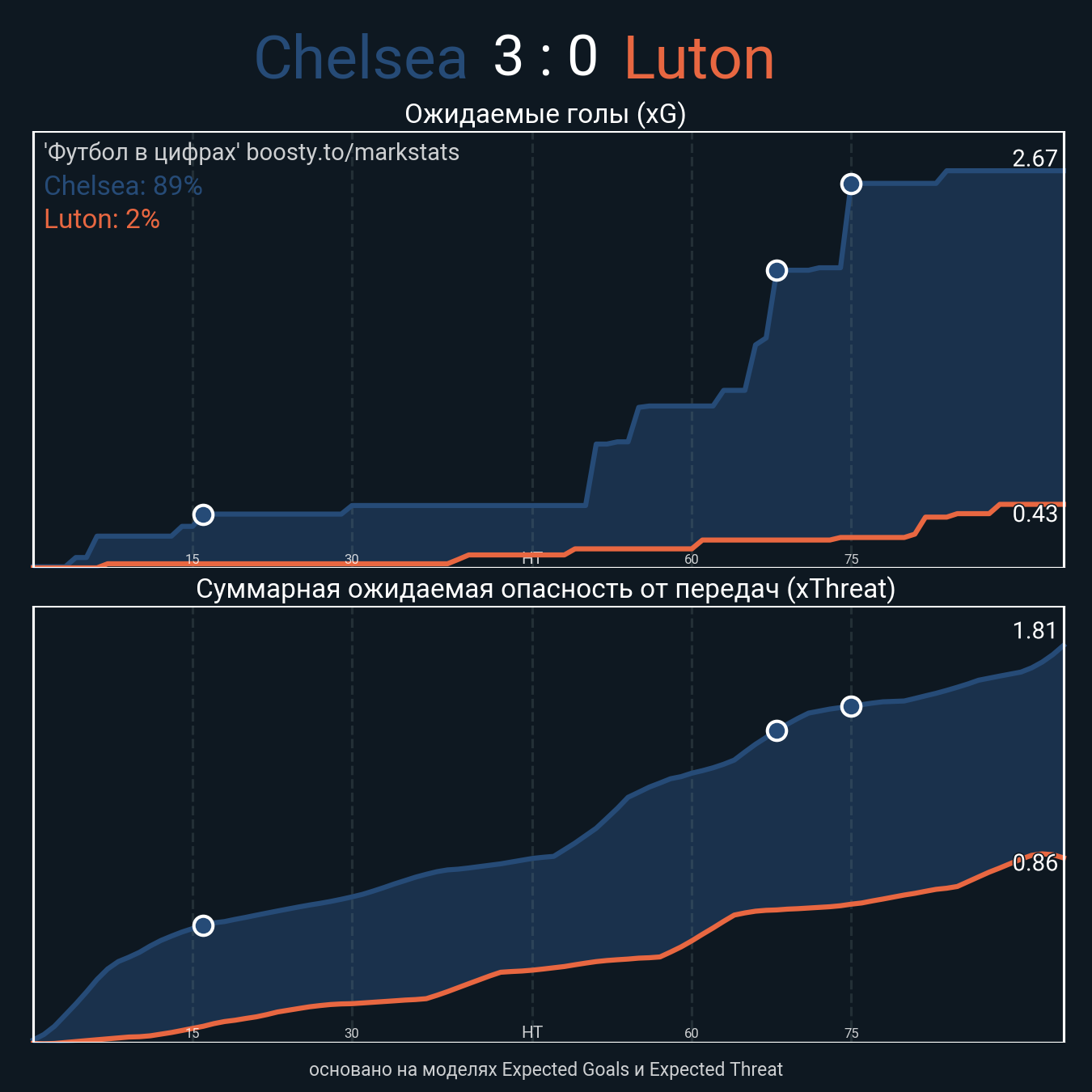 Ожидаемые голы (NPxG): 2.67 - 0.43