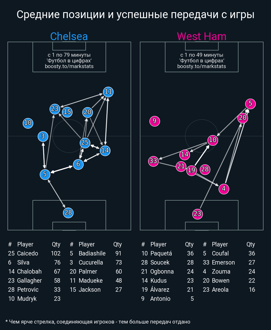 67 успешных передач из 70 попыток (4 с продвижением, 6 на трети соперника)