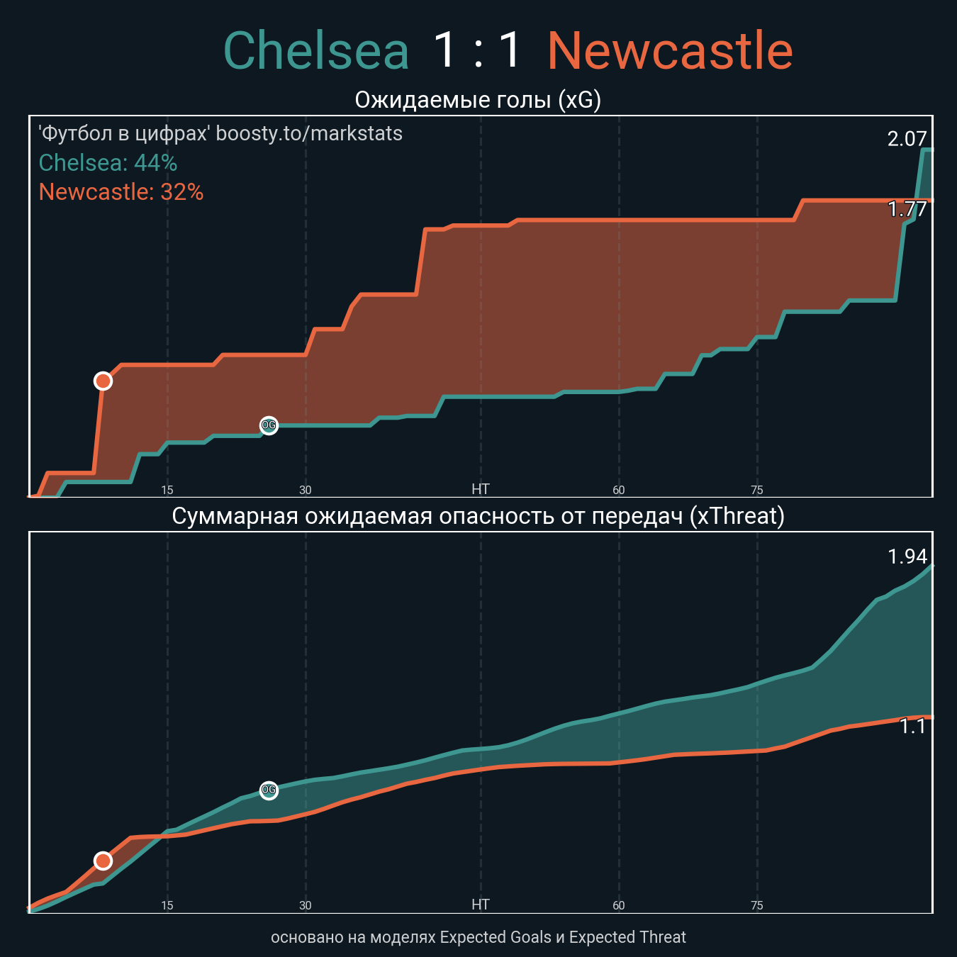 Ожидаемые голы (NPxG): 2.07 - 1.77