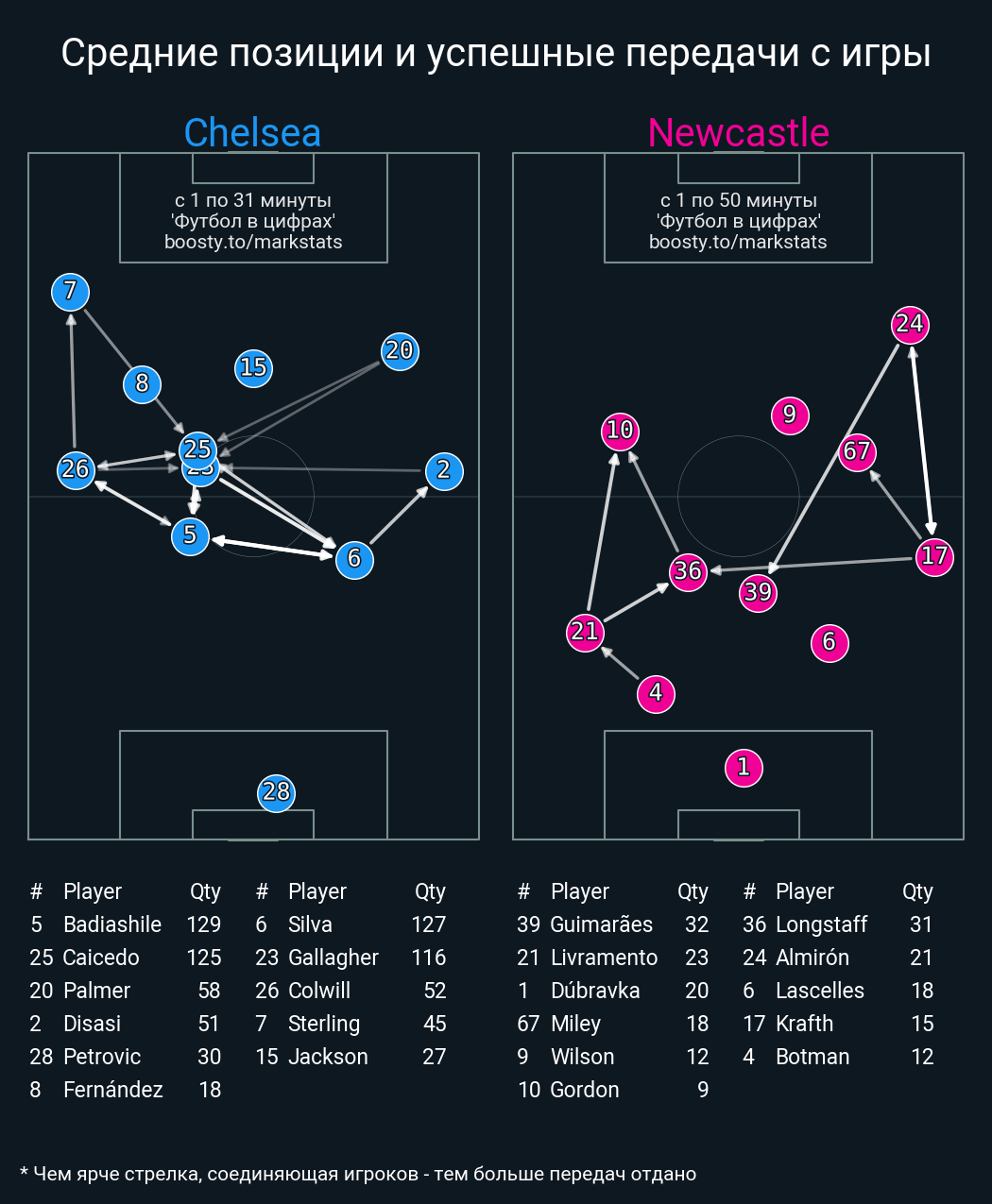 126 успешных передач из 132 попыток (7 с продвижением, 2 на трети соперника)