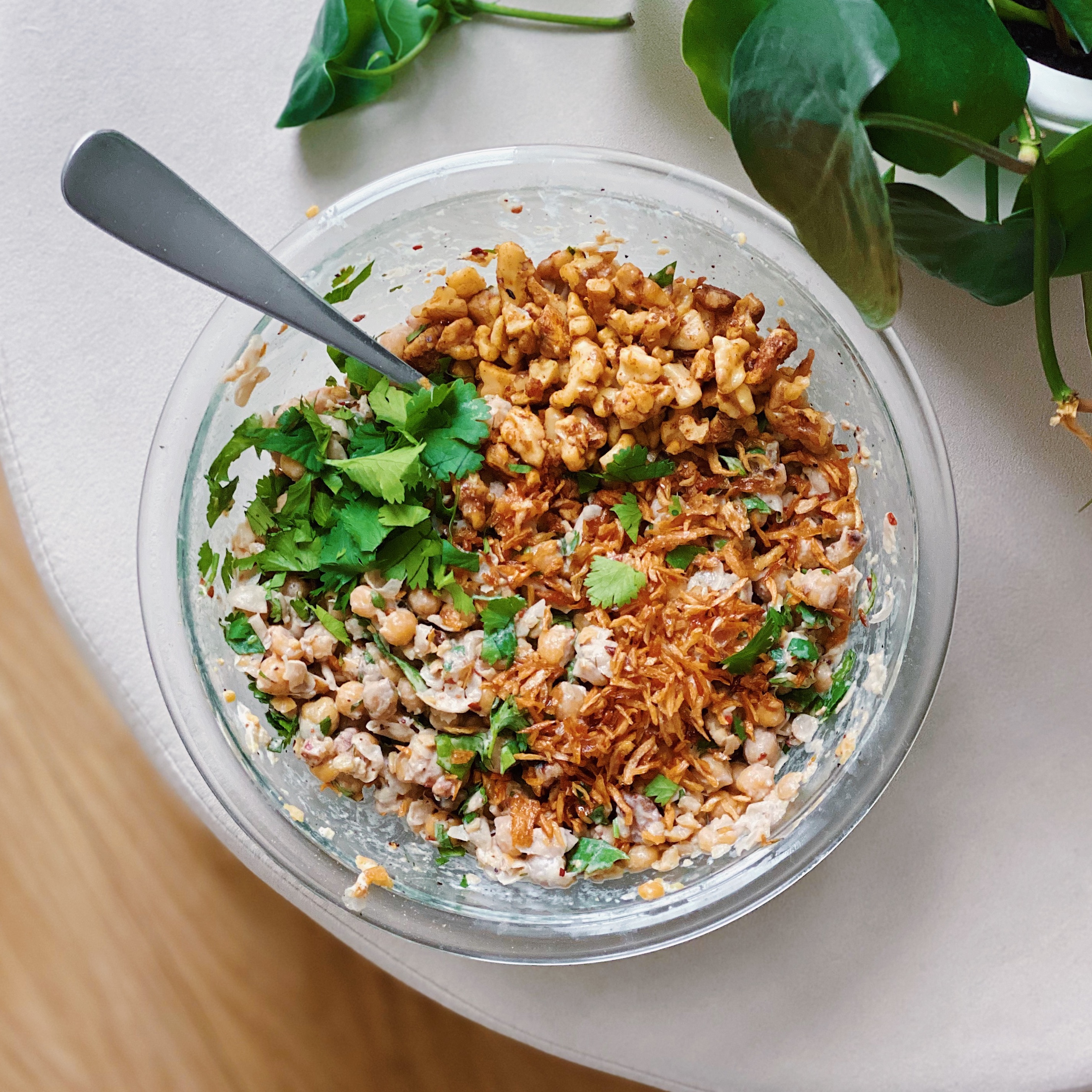 Hummus is the Arabic word for chickpeas, which are often cooked and ground into a paste and mixed with tahini (sesame seed paste), the blend called ḥummuṣ bi ṭaḥīna . Chickpeas are roasted, spiced, and eaten as a snack, such as leblebi . By the end of the 20th century, hummus had become commonplace in American cuisine. [22] By 2010, 5% of Americans consumed hummus on a regular basis, [22] and it was present in 17% of American households. [23]
