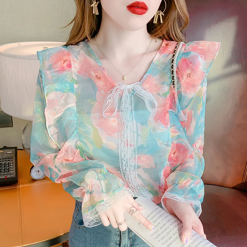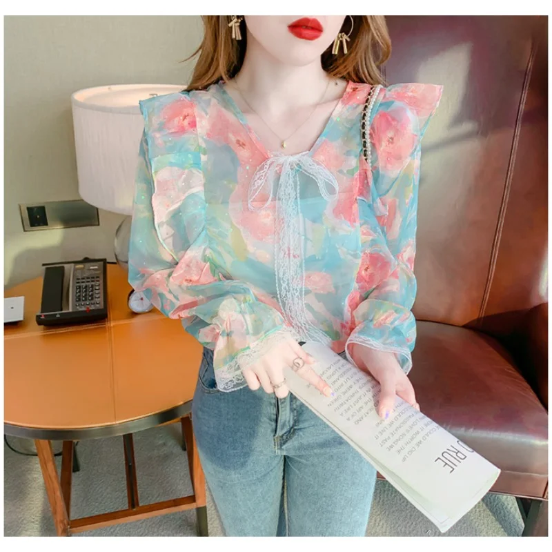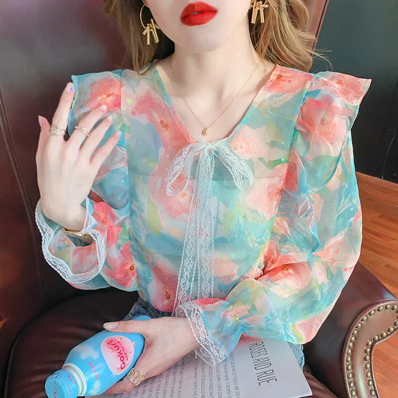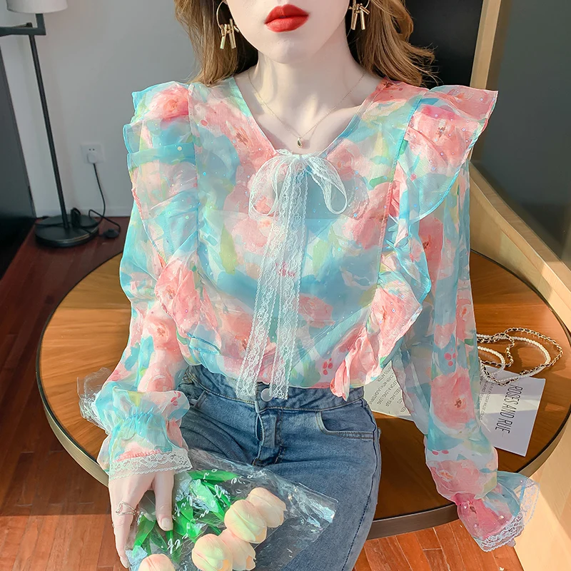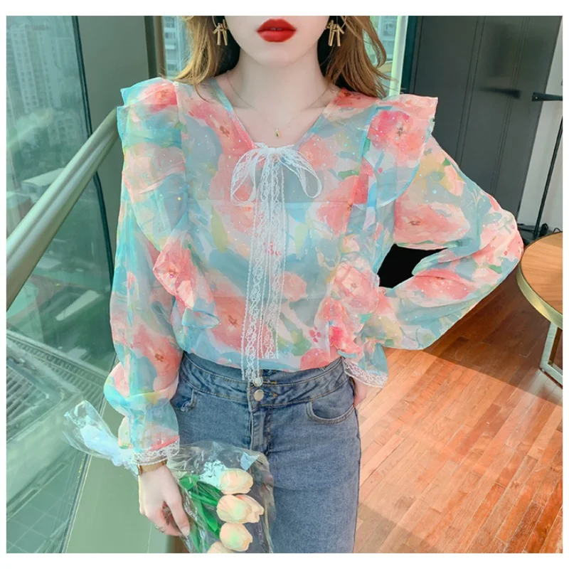 Chiffon Shirt 2023 Spring New Fragmented Flower Design Feeling Small and Popular Ruffle Edge French Style Long Sleeve Top Women - Купить с бесплатной доставкой