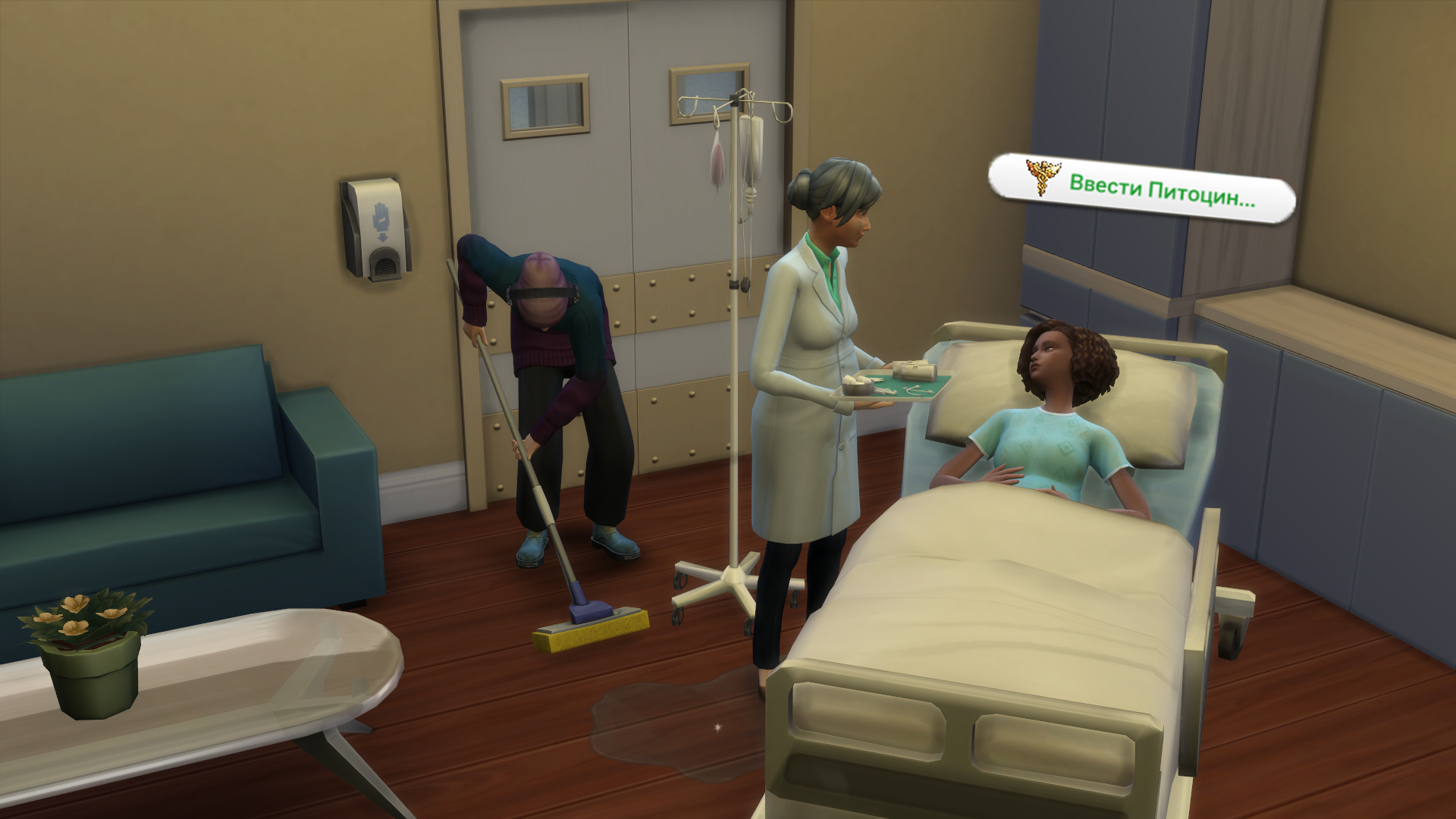 Но так же вы можете попросить врача/акушера вколоть симу Питоцин. Для этого необходимо нажать на больничную кровать "Комфортная горка" и выбрать действие "Ввести Питоцин...". Это самый быстрый способ вызвать полное раскрытие шейки матки сима.
