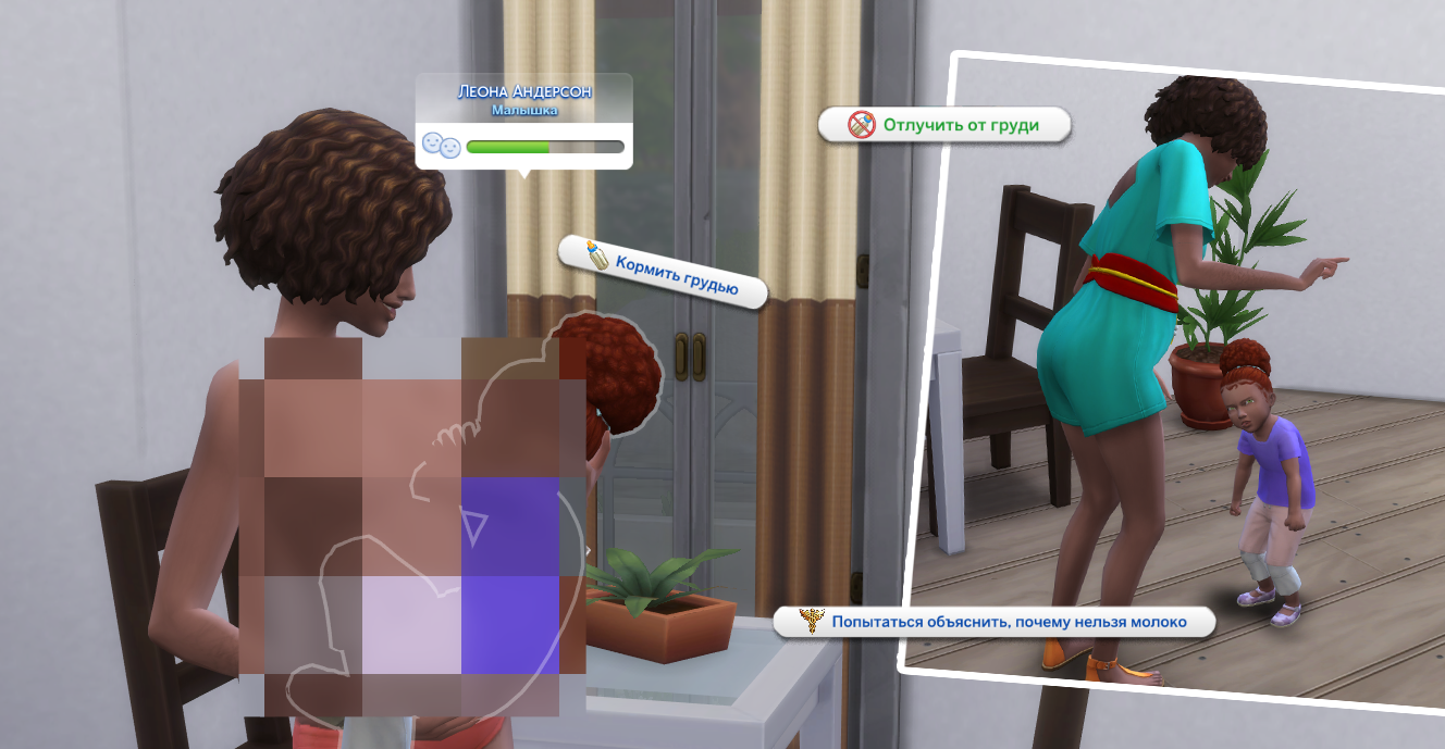 5) Слишком долгое пребывание без сцеживания иногда может вызвать протечку и оставить пятна на одежде вашего сима. Избавиться от них можно с помощью действия "Сменить одежду на чистую" или приняв душ/ванну.