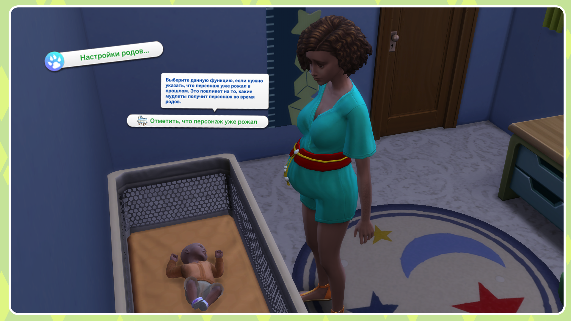 5) Экстренные роды могут произойти во время домашних родов. Вероятность того, что это произойдет с симом, беременным одним ребенком, составляет 10 %, а с симом, беременным несколькими детьми, — 30 %. Вы увидите уведомление и мудлет, который сообщит вам, что у вашего сима может быть задержка родов. В таком случае "раскрытие" замедлится и будет задерживать роды ещё больше, но есть вероятность, что через час всё вернется в норму. Но лучше не игнорируйте в таком случае действие "Проверить ребёнка" у акушера.