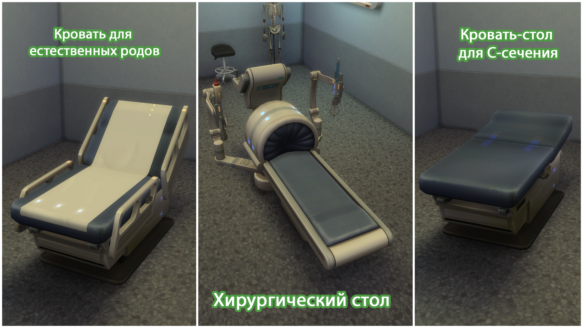 Изменить вид родов можно с помощью клавиши SHIFT, зажав её и на жав на стол вам откроются варианты объектов для тех или иных родов "Хирургический стол", "Кровать-стол для С-сечения" или "Кровать для естественных родов".