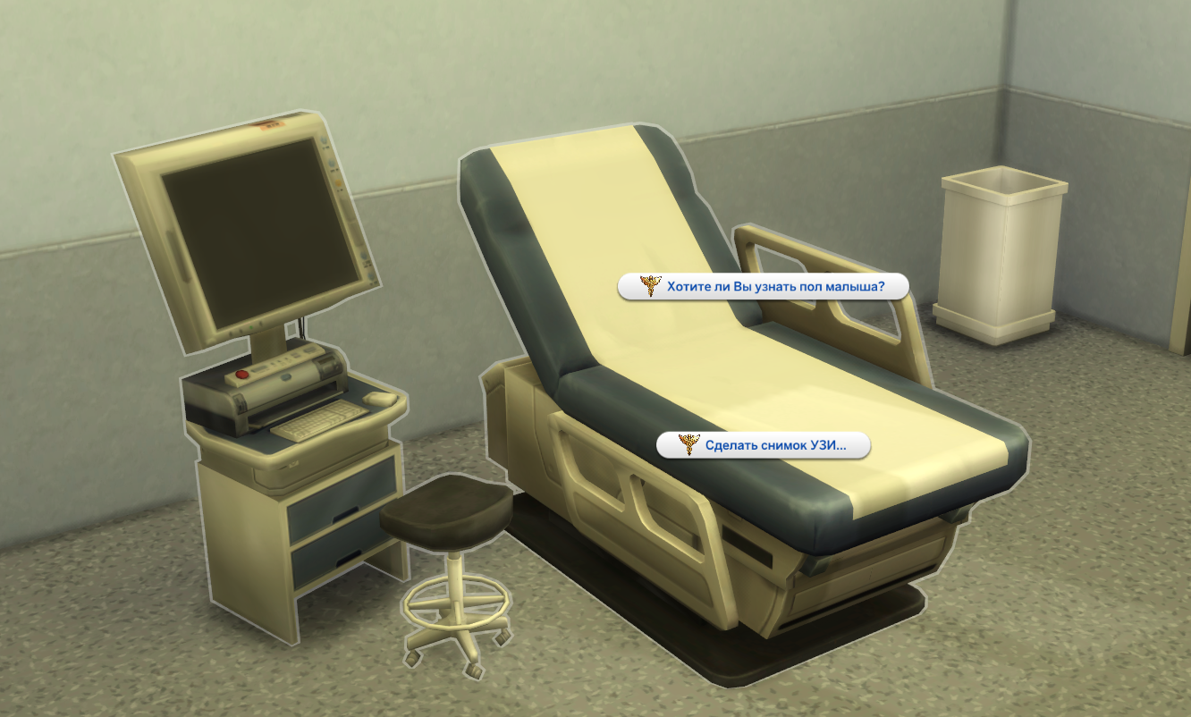 4) В зависимости от того какой способ родов вы выбрали в самом начале (через действие "Позвонить акушеру..."), будет зависеть внешний вид и анимация родов у объекта "Хирургический стол". Если вы выбрали "Естественные роды", то при нажатии на "Хирургический стол" и выбрав действие "Родить" он превратится в родильную кровать.
