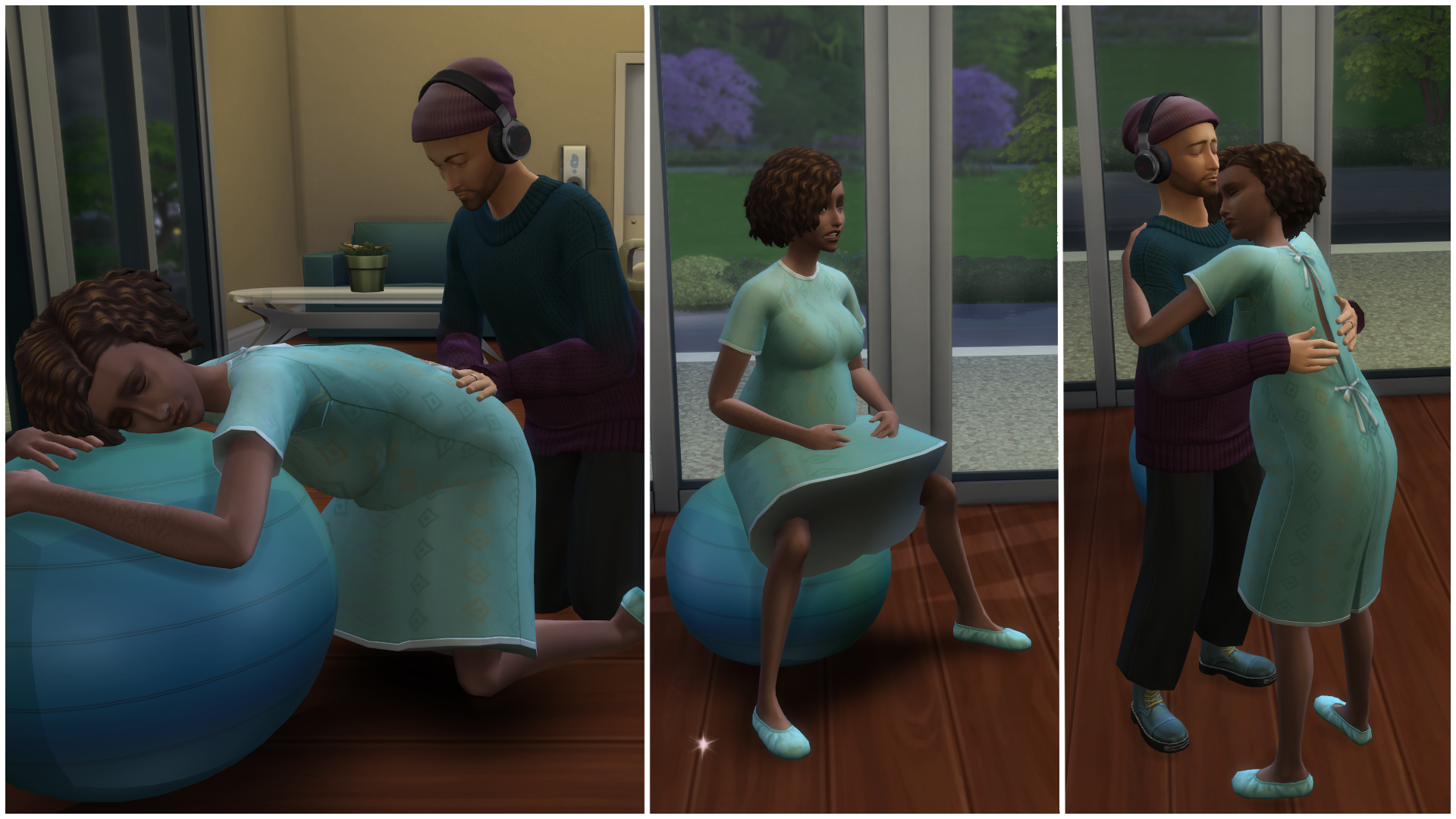 3) Способы способствующие раскрытию шейки матки у сима, которые описывались в статье выше, так же подходят и для родов в домашних условиях. Беременный сим может позаниматься с фитнес мячом, прогуляться, принять ванную, выполнить дыхательное упражнение. Или же попросить партнёра по родам сделать массаж спины, покачаться в объятьях и понежиться в бассейне (доступно только возлюбленным). Выполнение этих действий также поможет вашему симу облегчить схватки.