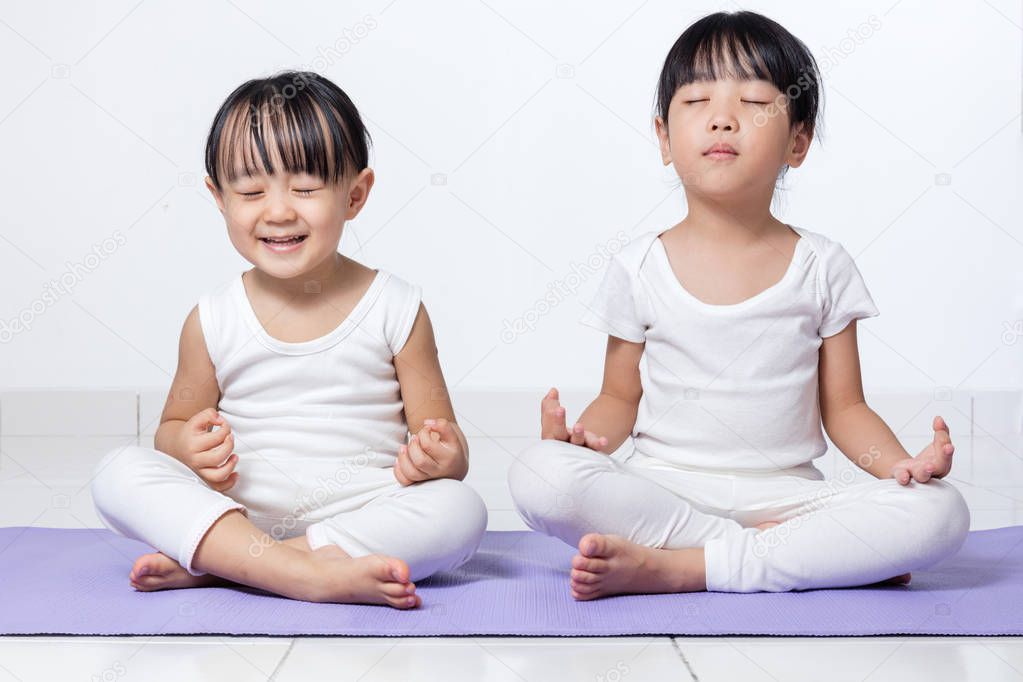 Asian Chinese little girls practicing yoga pose. On a mat indoor