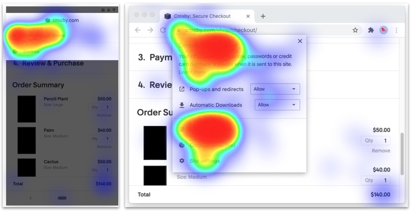 When shown Chrome UI in research studies, users would look at the padlock to evaluate the trustworthiness of a hypothetical ecommerce site. We showed the site controls to experiment participants. The overlaid heat-maps represent the click patterns of respondents who were asked to indicate any information which was perceived helpful in the scenario.