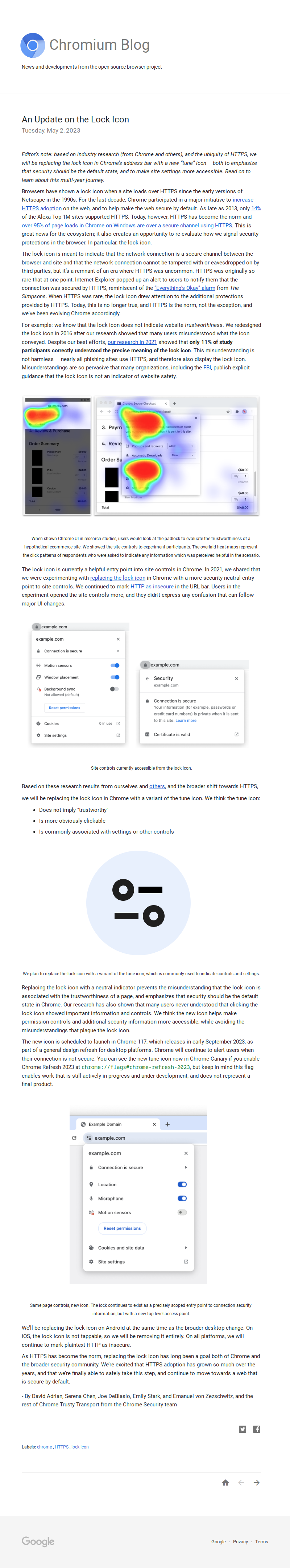 Based on these research results from ourselves and others, and the broader shift towards HTTPS, we will be replacing the lock icon in Chrome with a variant of the tune icon. We think the tune icon: