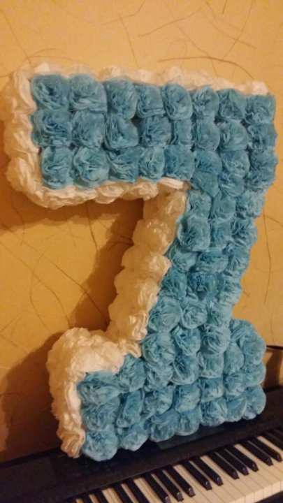 Дочь тоже захотела сделать себе на день рождения цифру из салфеток . На просторах интернета нашлась маленькая картинка цифры 7 , которую вначале увеличили до размера А 4, показалось мало .