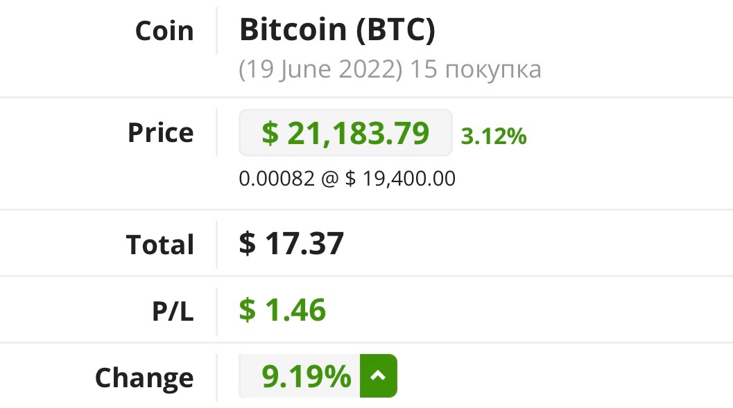 на них я приобрела 0,00082 монеты BTC (по курсу BTC/USDT 19400$)