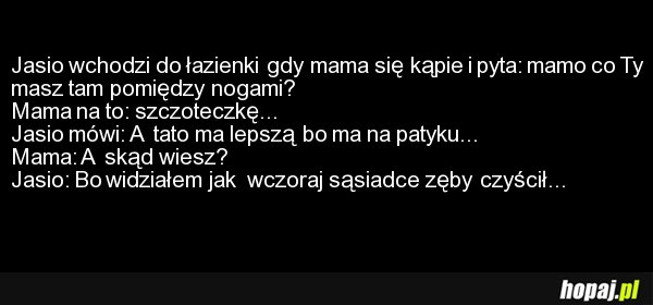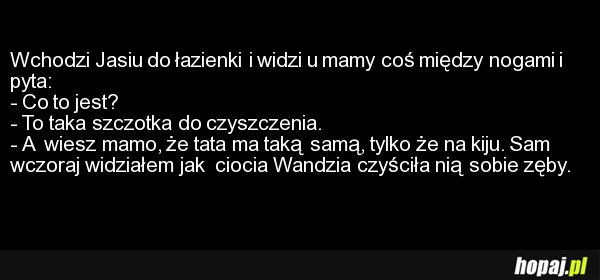 Wchodzi Jasiu do łazienki i widzi u mamy coś między nogami i pyta: - Co to jest? - To taka szczotka do czyszczenia . - A wiesz mamo, że tata ma taką samą, tylko że na kiju . Sam wczoraj widziałem jak ciocia Wandzia czyściła nią sobie zęby .