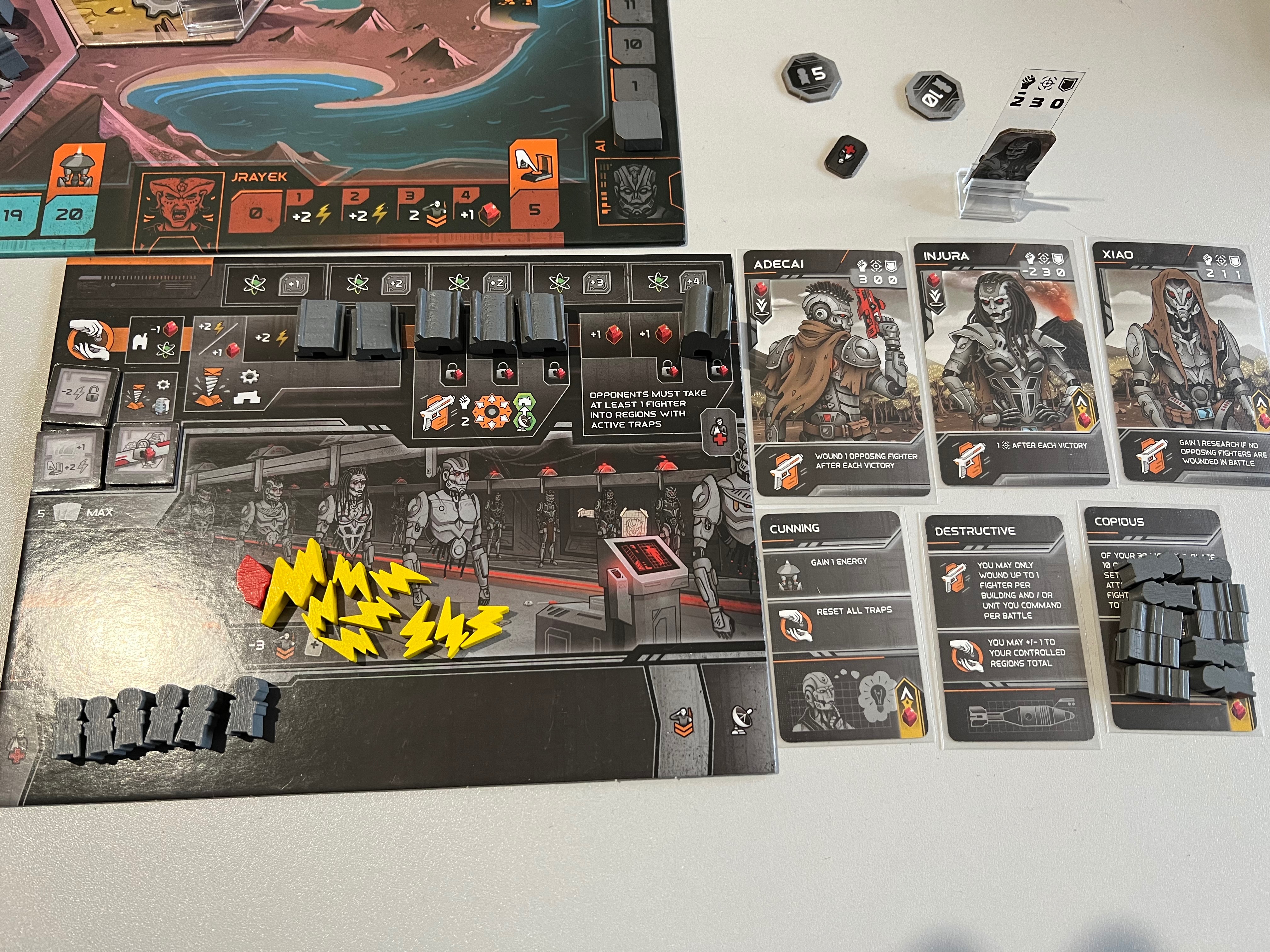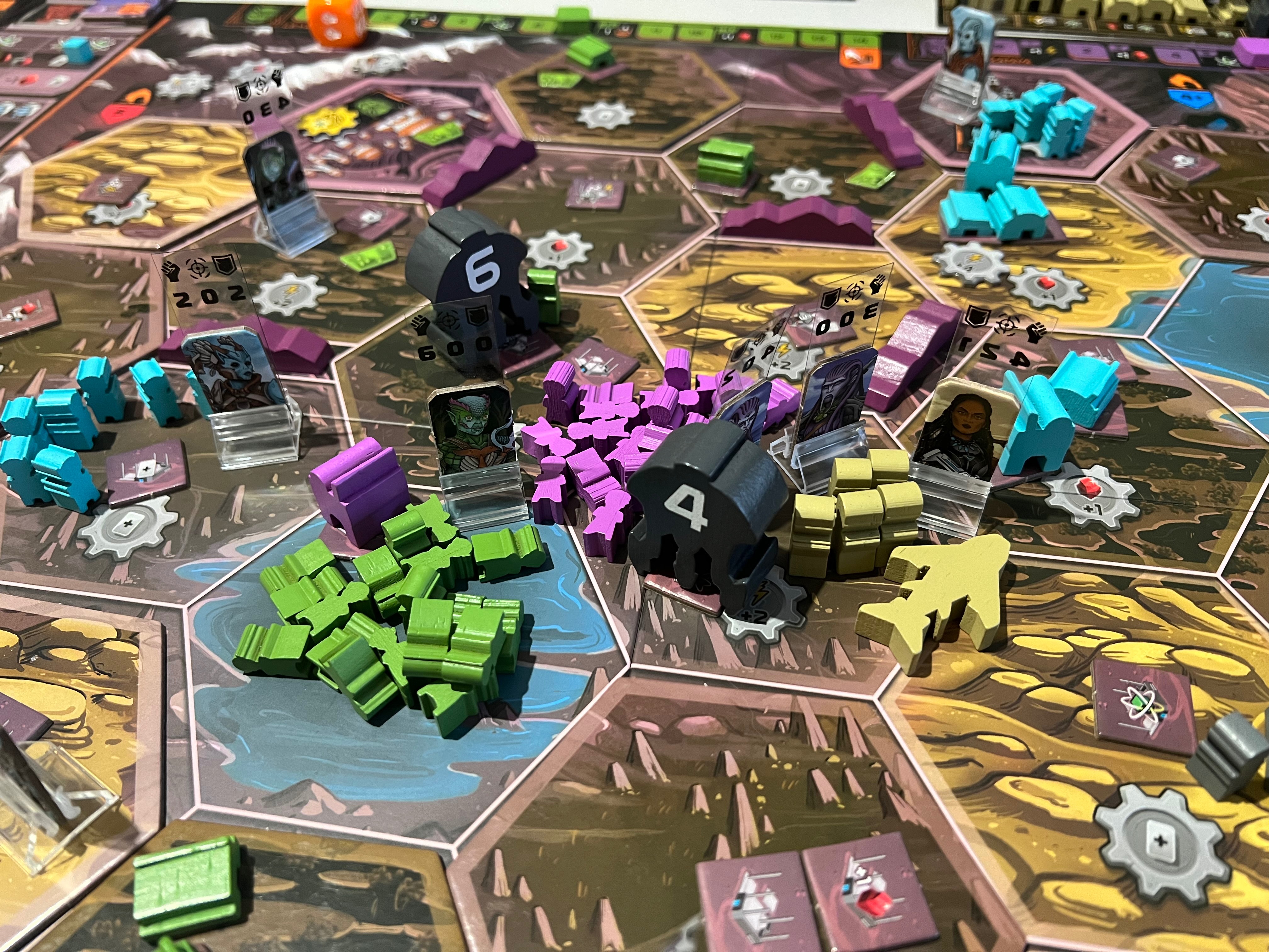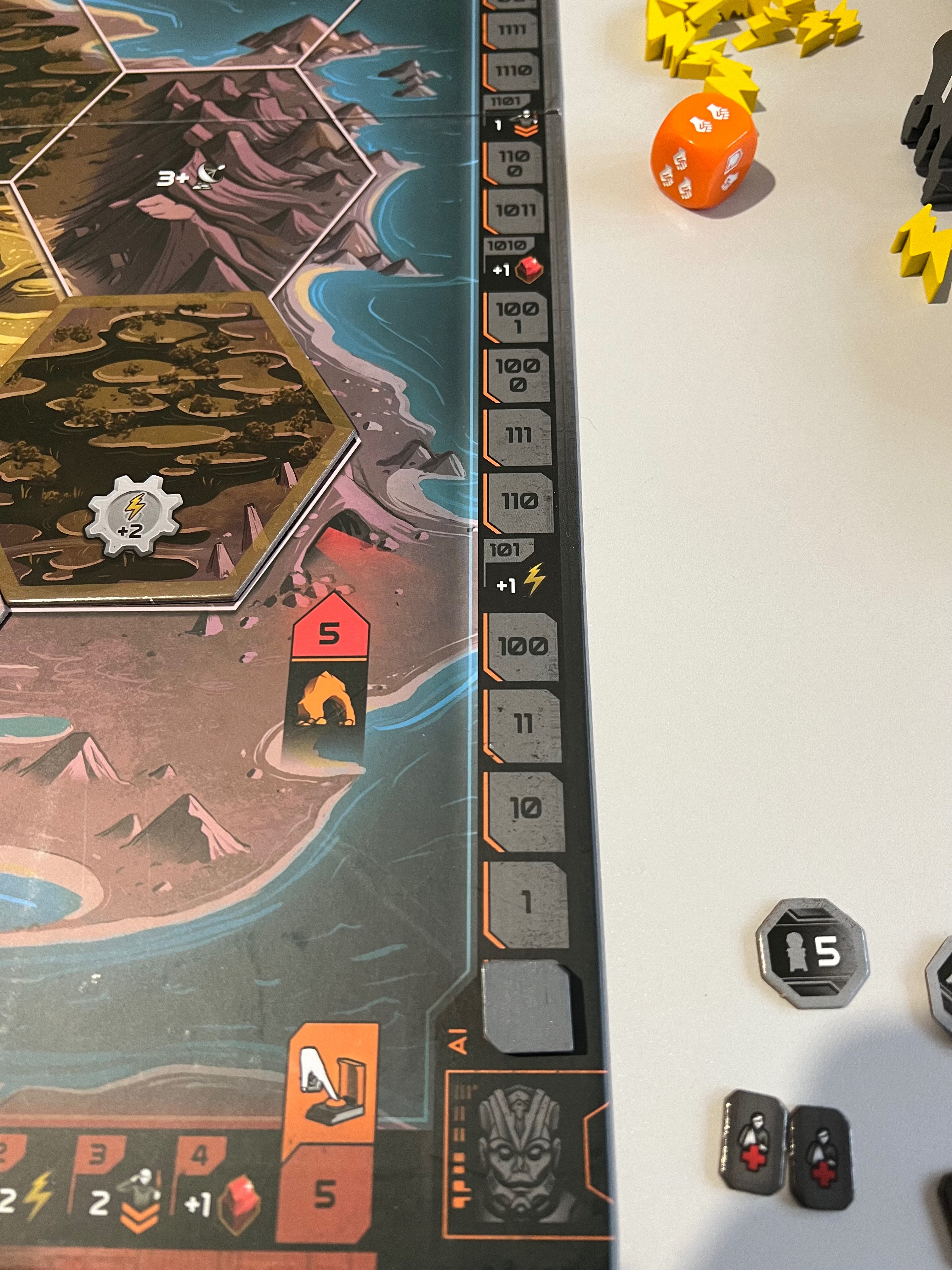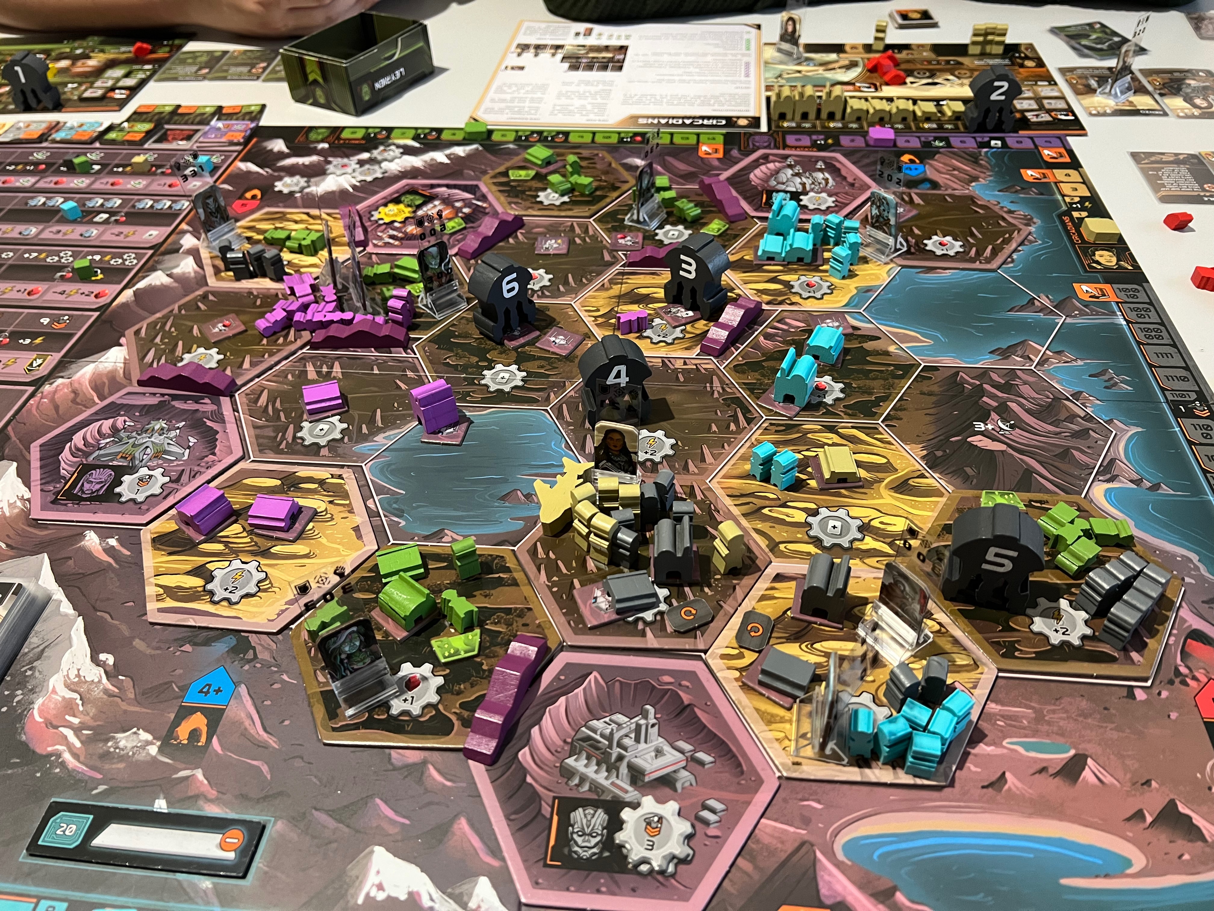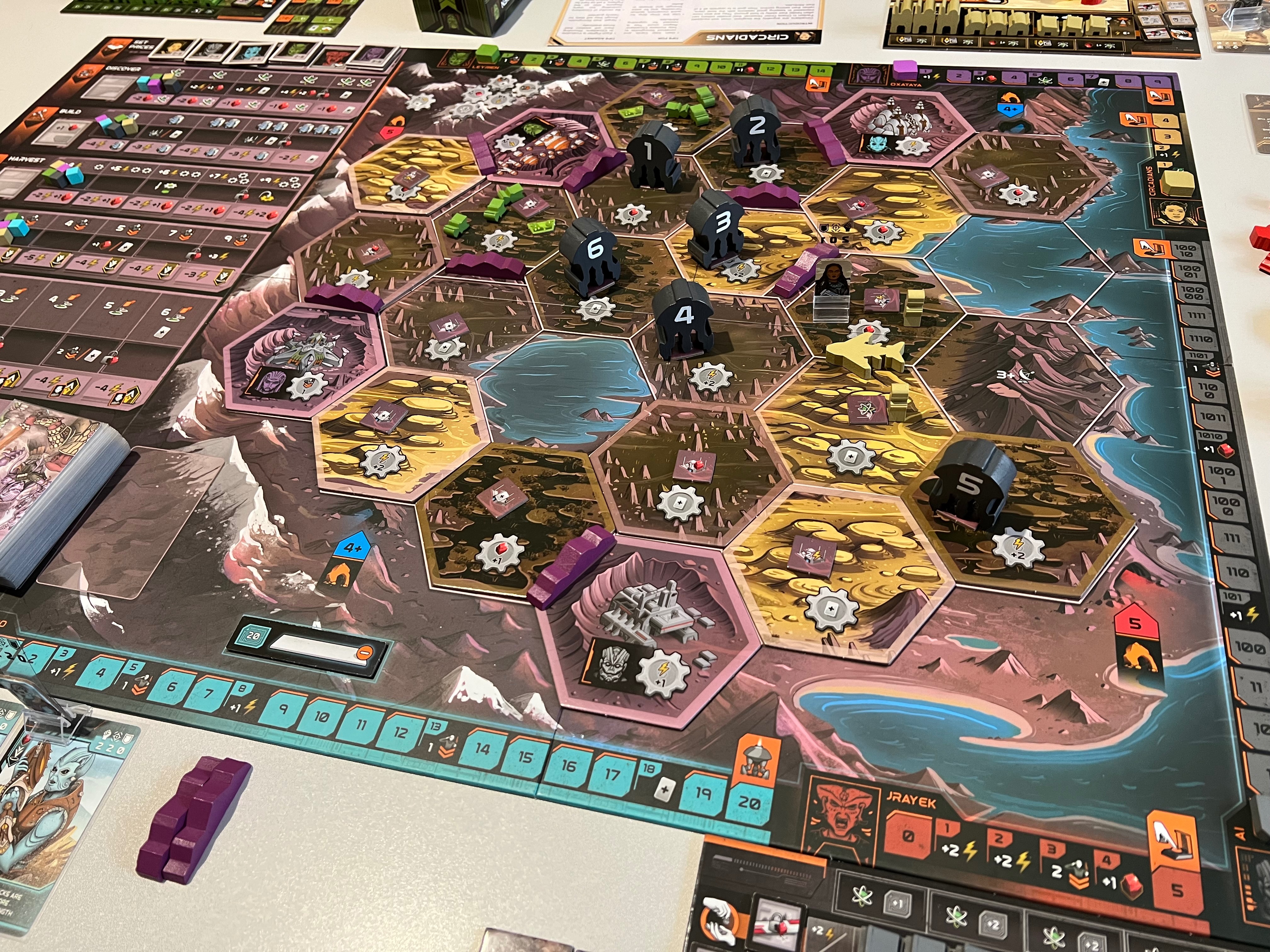 ➕Есть желтые - циркадианцы. По факту это люди, у них даже постоянной базы нет, их база передвижная - самолёт, летающий между гексами. Их трек очков таков, что им нужно перевернуть 4 карты их особых свойств, а переворачиваются такие карты как раз в качестве бонуса, если вы контролируете 6+ гексов, чего у нас не было ни у кого) А казалось бы, им пройти всего 4 деления на треке… Из особых фишек у циркадианцев каждый юнит считается силой за 2. А ещё если самолёт граничит со спорным гексом - он тоже даёт +2 силы.