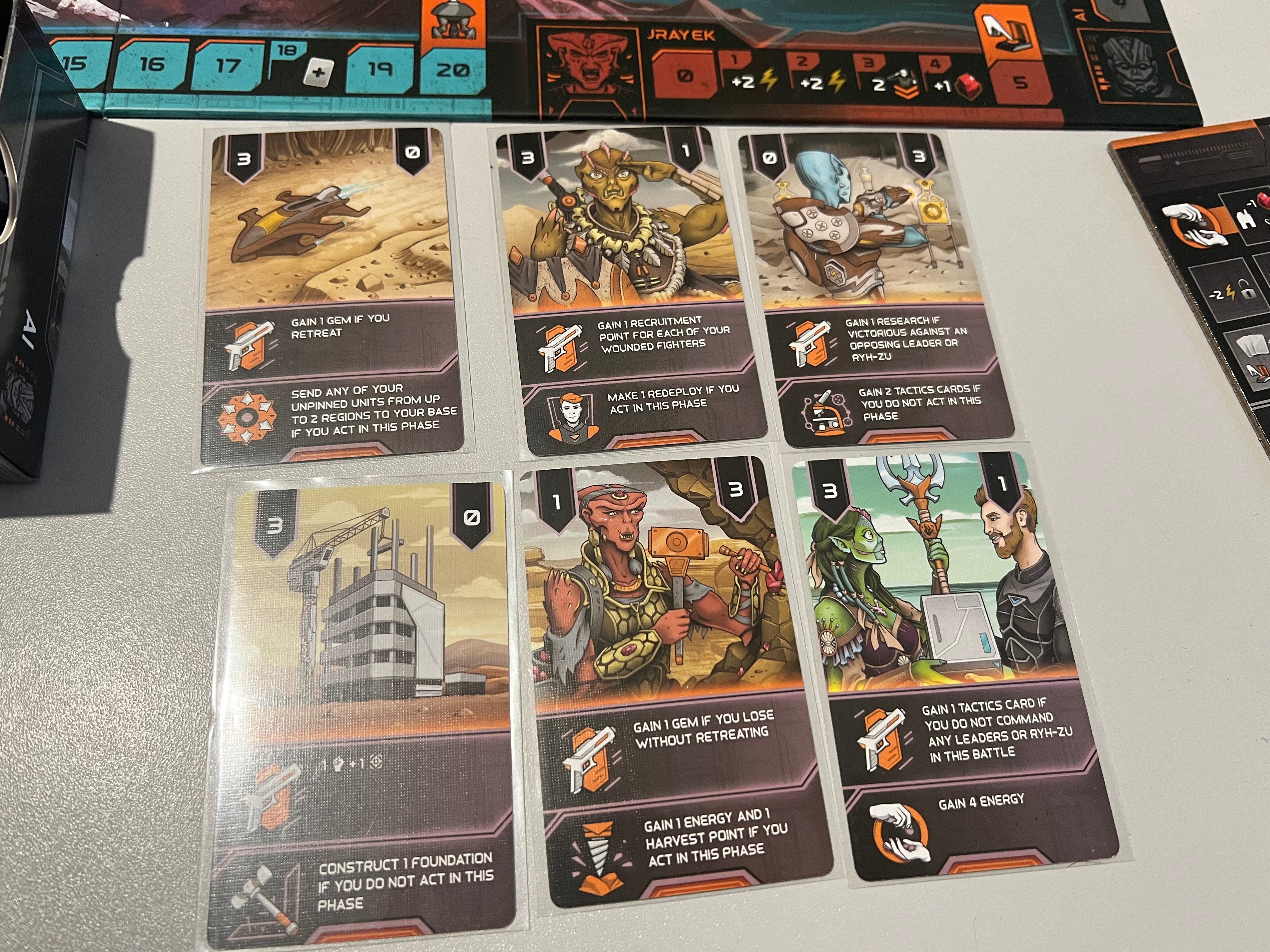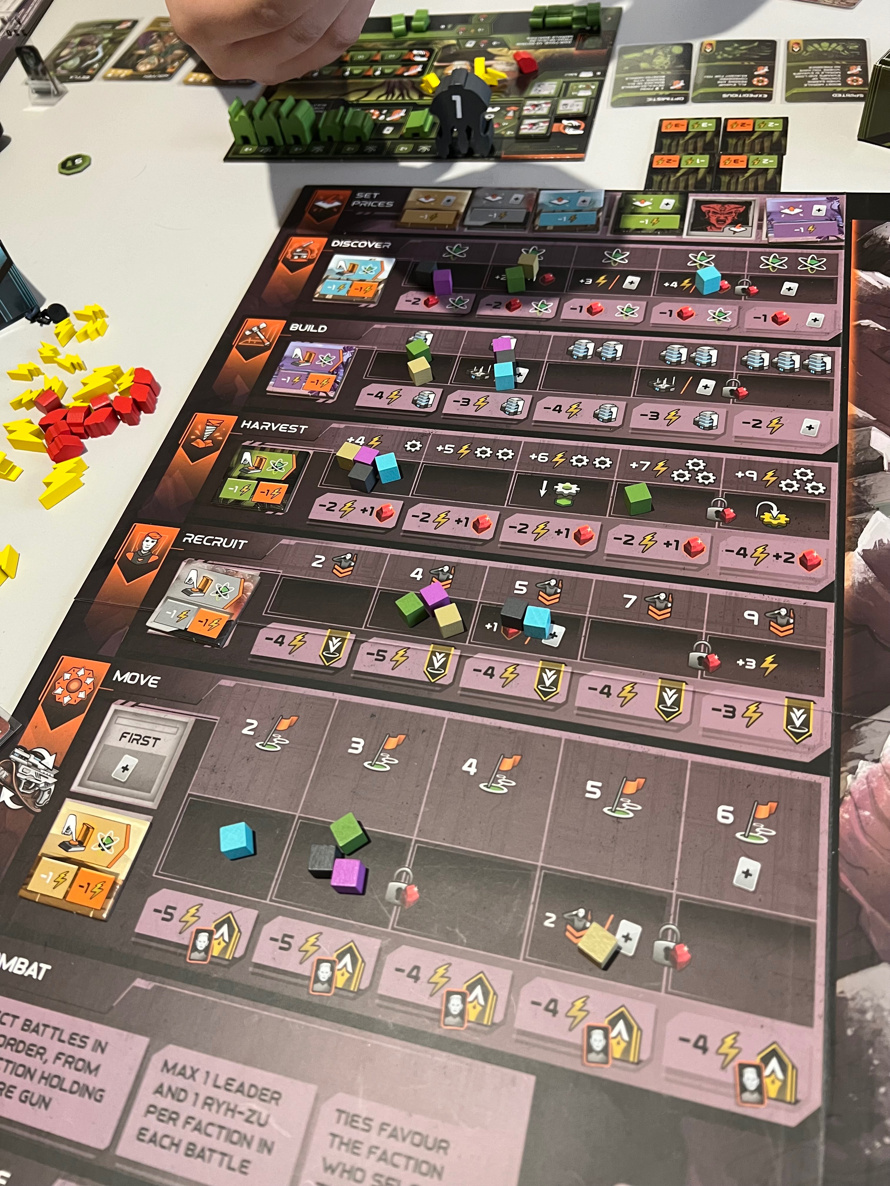 Есть 5 действий: исследование, строительство, получение ресурсов, найм и перемещение. Каждое действие - это шкала, и это действие можно прокачивать исследованием, выполняя более жирные действия. Так вот, первая фаза - это выставление плашек цены на определённое действие. Плашки цены - это особые тайлики каждого игрока с ценой действия, которую выполняющие действие другие игроки должны будут заплатить в банк и ему, а сам игрок выполняет действие бесплатно.