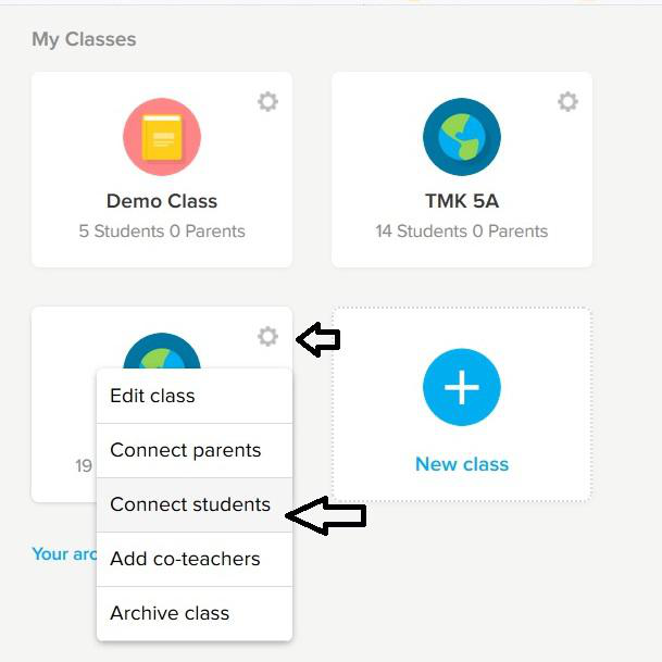 1. Sebelum itu, pastikan anda log in dalu class dojo anda. Kemudian anda cari kelas yang anda mahu. Anda klik icon setting kemudian anda klik connect student.