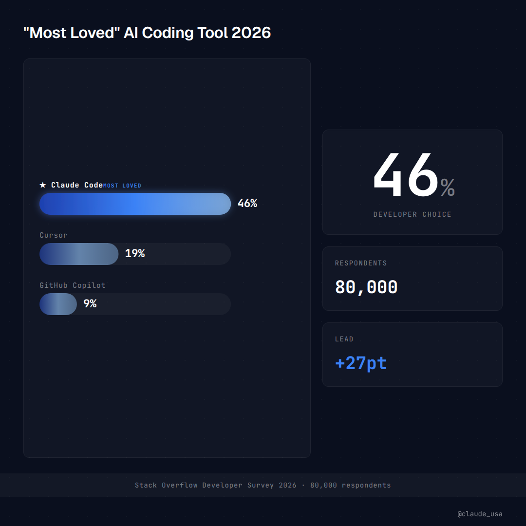 GitHub Copilot, which held the market for three years, dropped to 9% 'most loved' — from a peak of 42% in 2023. Cursor, the closest competitor, sits at 19%. Both have added agent features in response, but the gap has widened, not narrowed.