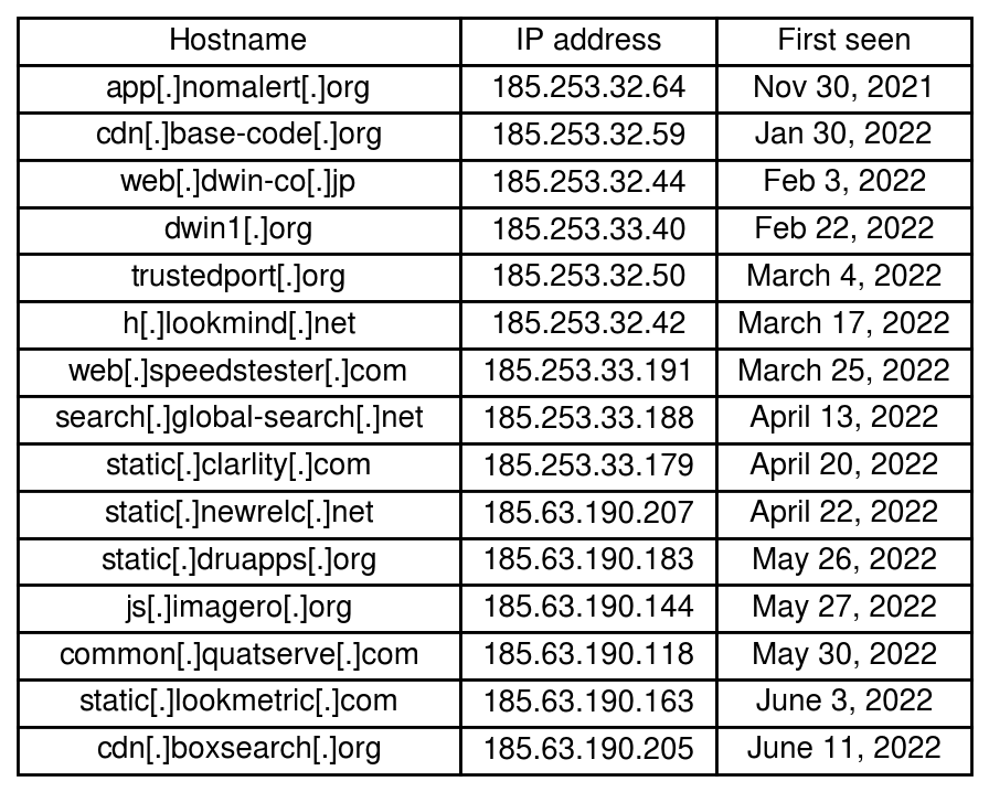 The table below shows hostnames, their IP address and the date they were first seen on urlscan.io. Most of those were previously unknown to us until we recently started this investigation. You can click on the hyperlinks to load the corresponding sandbox pages, but note that a majority of them do not contain the actual skimmer code. This is most likely because the malicious infrastructure detected that urlscan.io’s sandbox was not using genuine residential IP addresses.