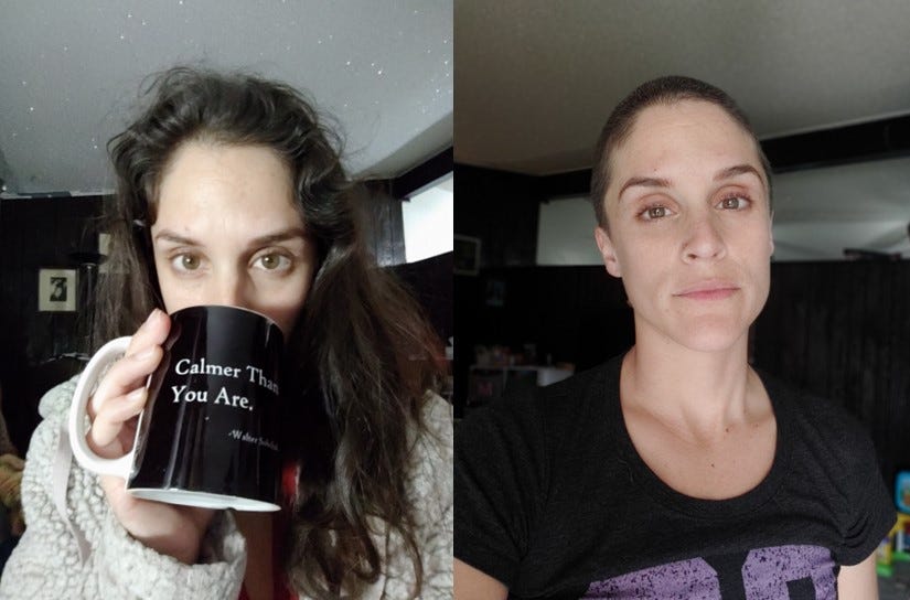 Well B .B . bad news babe, we are shaving it today, so it will be as short as it will go . She really had fun, and loved our guest stylist Heather! Hair isn't all B .B . is willing to take off, be still our heart! Her hair was softer then a poodle and thicker then a wall . Heather and some powerful wahl clippers versus B .B .'s hair, who will win?