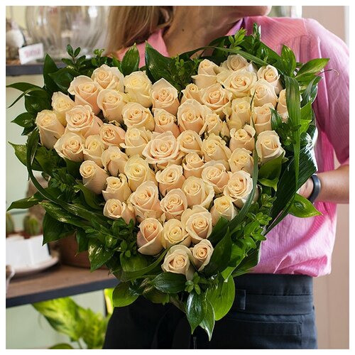 Composition en forme de coeur de roses (51 roses) couleur crème, variété "Taleya" avec verdure décorative