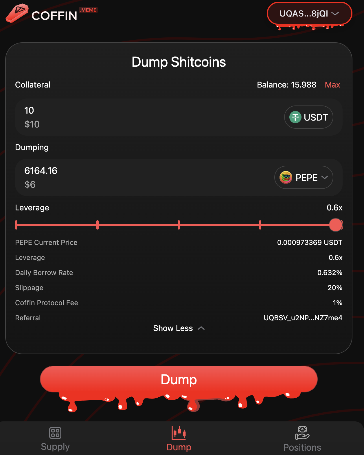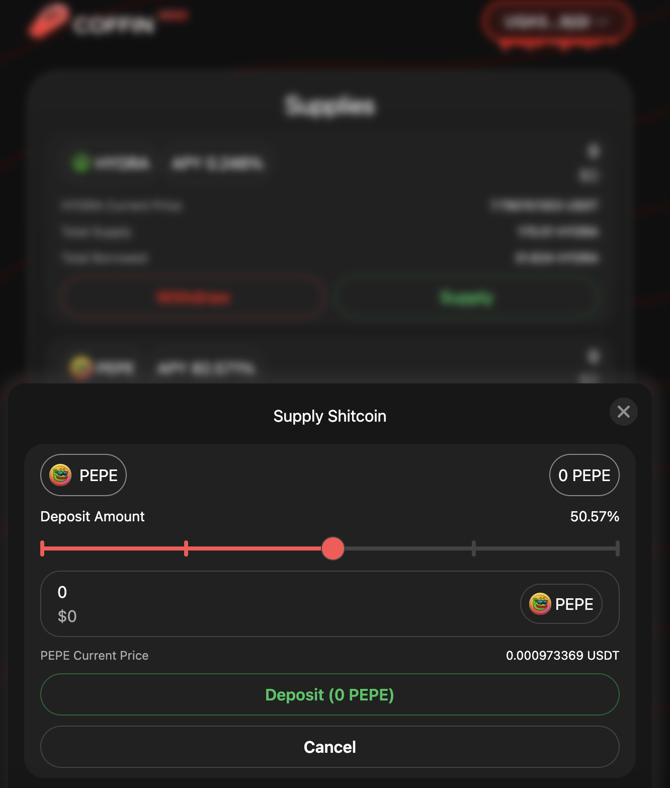 Теперь твой баланс +1500 USDT в Coffin и ты имеешь -524,000 $PEPE долга в Coffin.