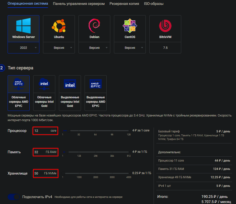Регистрируетесь на сервисе, пополняете баланс и создаёте сервер с примерно такими настройками: