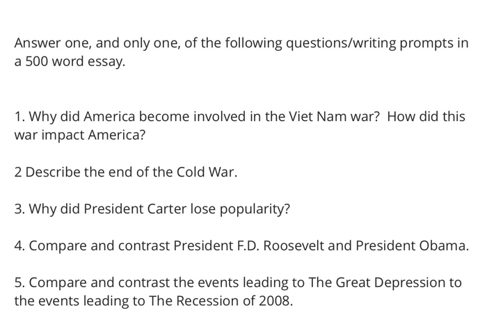Cold War Essay Questions . Each class will be given 4 of the following questions and will have 45 minutes to write an essay format answer . Remember that many of these prompts are really the same prompt with a twist . That will be the case next year as well .