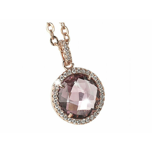 Collier en bronze plaqué or rose avec pendentif (2 cm de long) composé de cristaux de zircon améthyste (1,5 cm de diamètre).