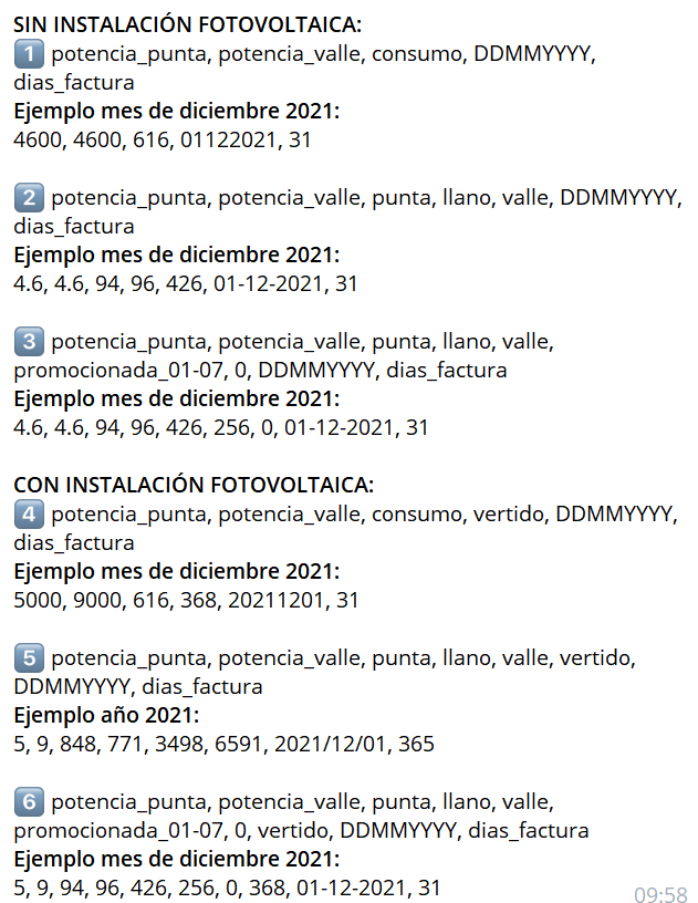 potencia punta, potencia valle, consumo punta, consumo llano, consumo valle, vertido total, DDMMYYYY, dias_factura