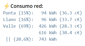 kWh consumidos de la red por tramos (punta, llano y valle) y el precio ponderado del kWh para tarifas indexadas (ojo! los precios mostrados son únicamente indexados y son aproximados).