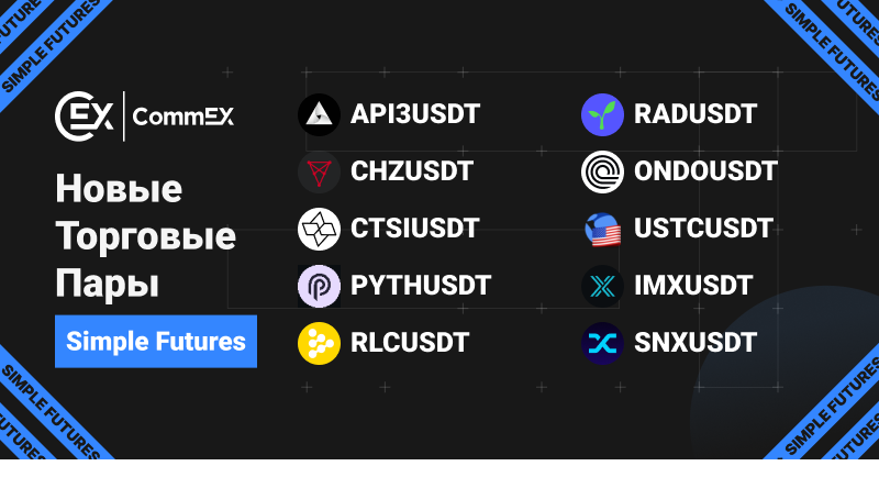 CommEX запустил контракты на Simple Futures - API3USDT, CHZUSDT, CTSIUSDT, PYTHUSDT, RLCUSDT, RADUSDT, ONDOUSDT, USTCUSDT, IMXUSDT и SNXUSDT