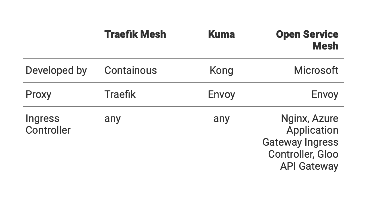 - Open Service Mesh 微軟所推出,官方明確表示目前還在重度開發中,不適合生產。Ingress Controller 限定搭配 Nginx, Azure Application Gateway Ingress Controller, Gloo API Gateway。