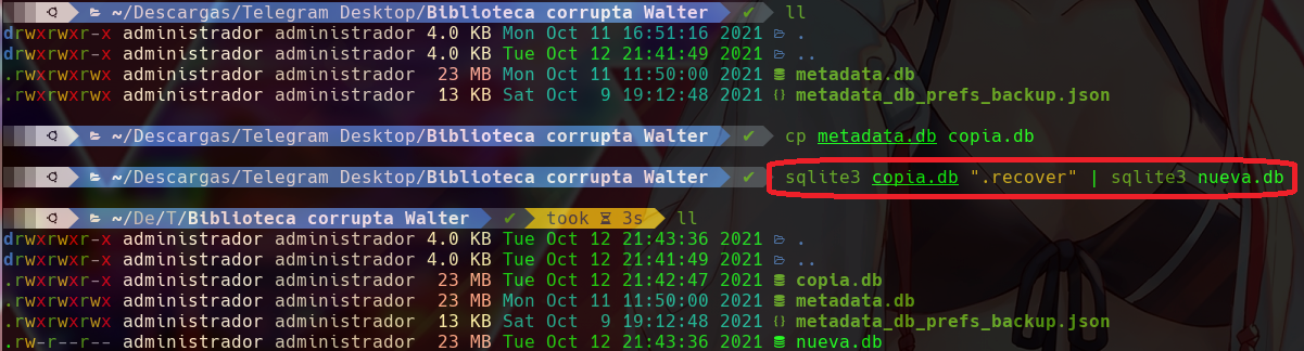 Solo tenemos que abrir una terminal, ir a la carpeta que contiene nuestra base de datos y ejecutar el comando para tratar de recuperar el contenido corrupto.