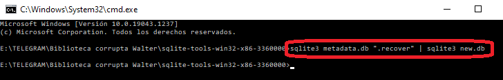 siendo broken.db el nombre de nuestra DB corrupta y nuevo.db el nombre de salida para la BD reparada.