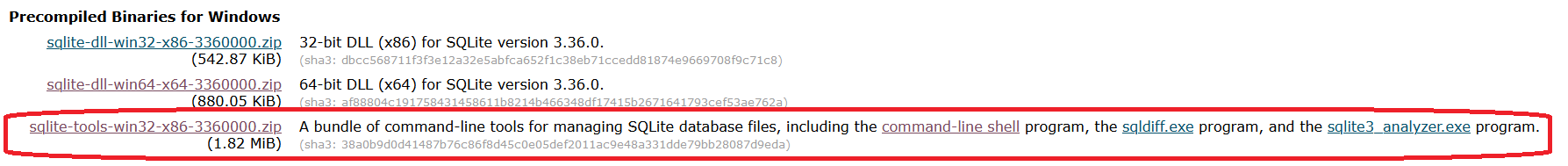 Descargamos desde la web oficial de sqlite3, en concreto la versión para windows compatible con la linea de comandos (el último de los 3 disponibles, ocupa unos 2mb)